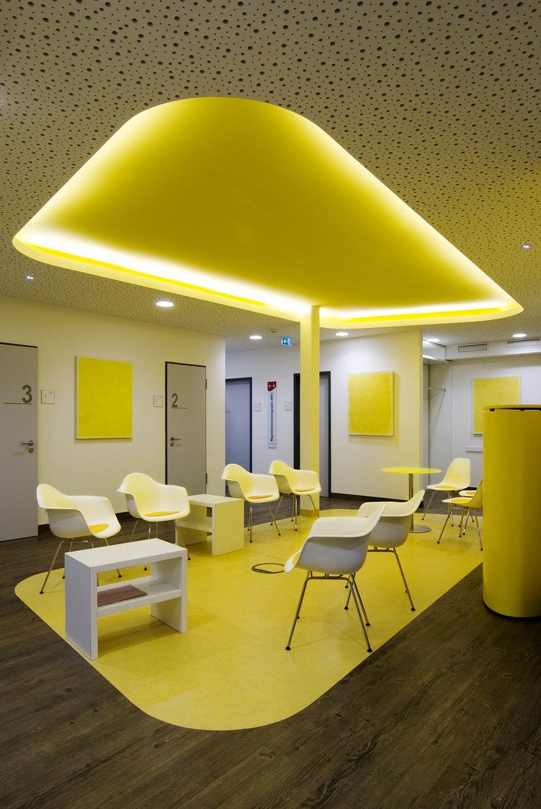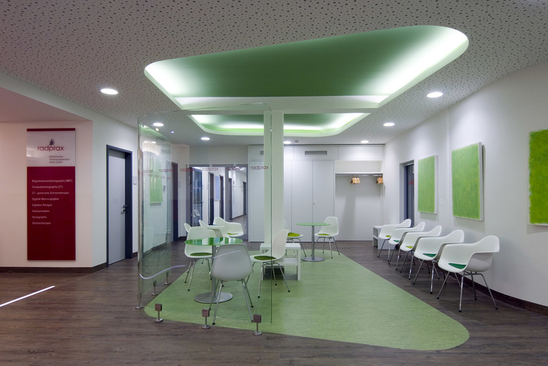 Aus diesem Grund wurde für die drei Wartebereiche und Behandlungsräume eigens ein radprax-Leitsystem nach Farbcodes entwickelt: Grün für die Nuklearmedizin, Blau für CT und MRT und Gelb für Ultraschall und Mammographie.