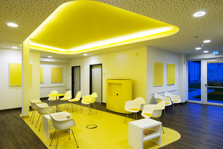 Die organischen Formen der gestalteten Böden und Decken stehen im Gegensatz zu den technoiden Geräten und sorgen für eine aufgelockerte Atmosphäre.