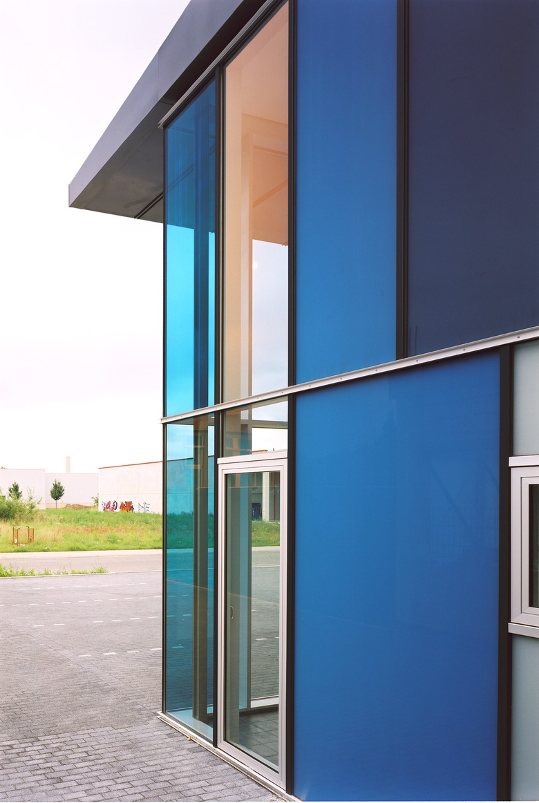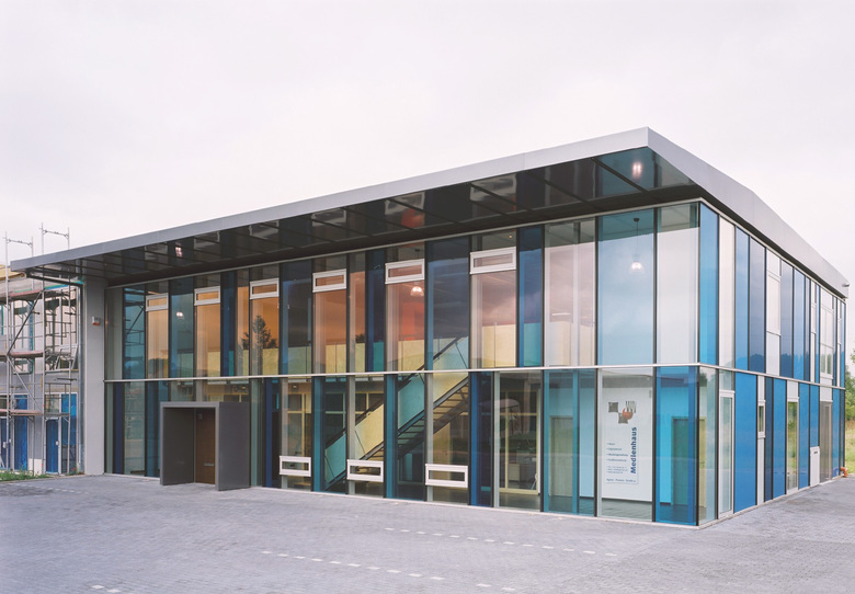 Als Gebäude für einen Mediendienstleister ist die Architektur sehr graphisch und lebt von der sauberen und exakten Ausarbeitung der Details, so z.B. bei der scharfkantigen Faltung des schwebenden Daches.