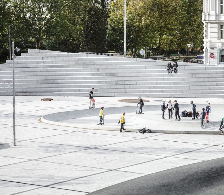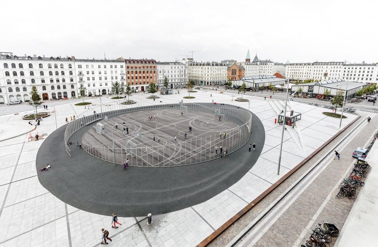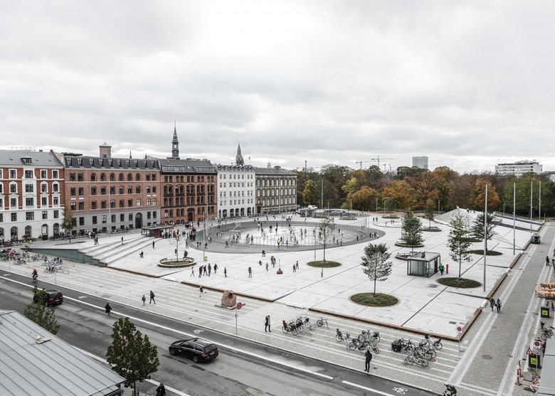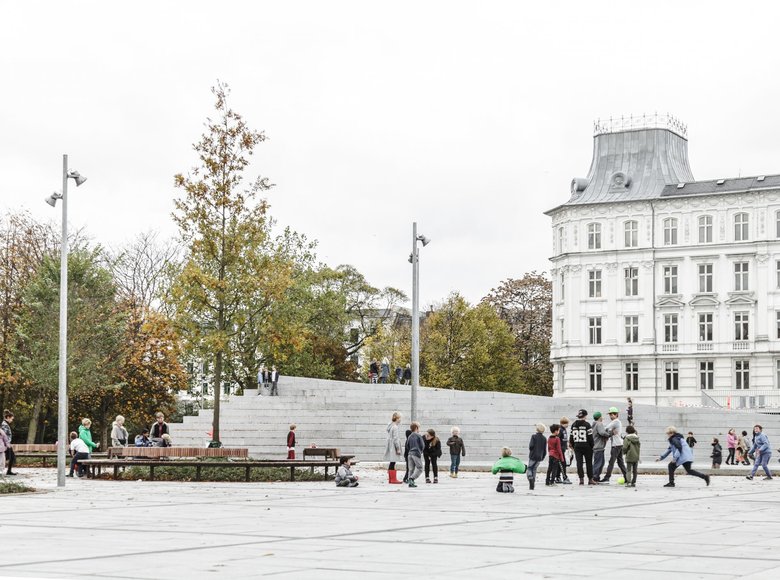 The new Israel's Square consists of a folded surface floating above the ground - like a flying carpet. The square, or surface, hovers between two worlds: the city and the neighboring Ørsted Park. The park wanders into the square as a series of cut-outs on this surface, and folds are placed towards east and west to create sitting areas. Different features and facilities are created on the surface, inviting visitors to stay. For example, niches with bench formations under the tree crowns, a lowered green playground area close to N. Zahle's School, areas for ball games and play and a trickling waterfall.