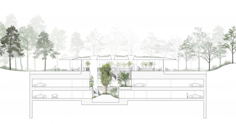 In addition to the gardens, the park features a central greenhouse with a café, giving access to car parking underneath the park’s surface. The greenhouse is designed as an organically shaped glass structure with a hovering roof, intended to surprise and delight visitors as they navigate the lush landscape. The greenhouse and café will ensure that The Opera Park remains a vibrant destination year-round, even during winter when many of Copenhagen’s parks are desolate. Inside, the greenhouse terraces down to the parking levels, which accommodate up to 300 cars, while its subtropic biotope also descends to vertically weave together the park with the underground levels.