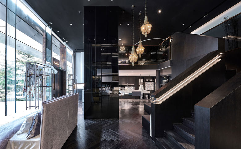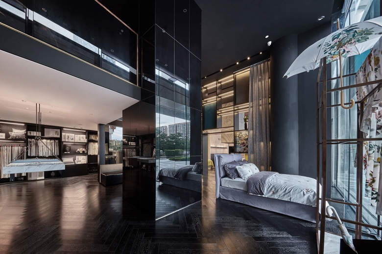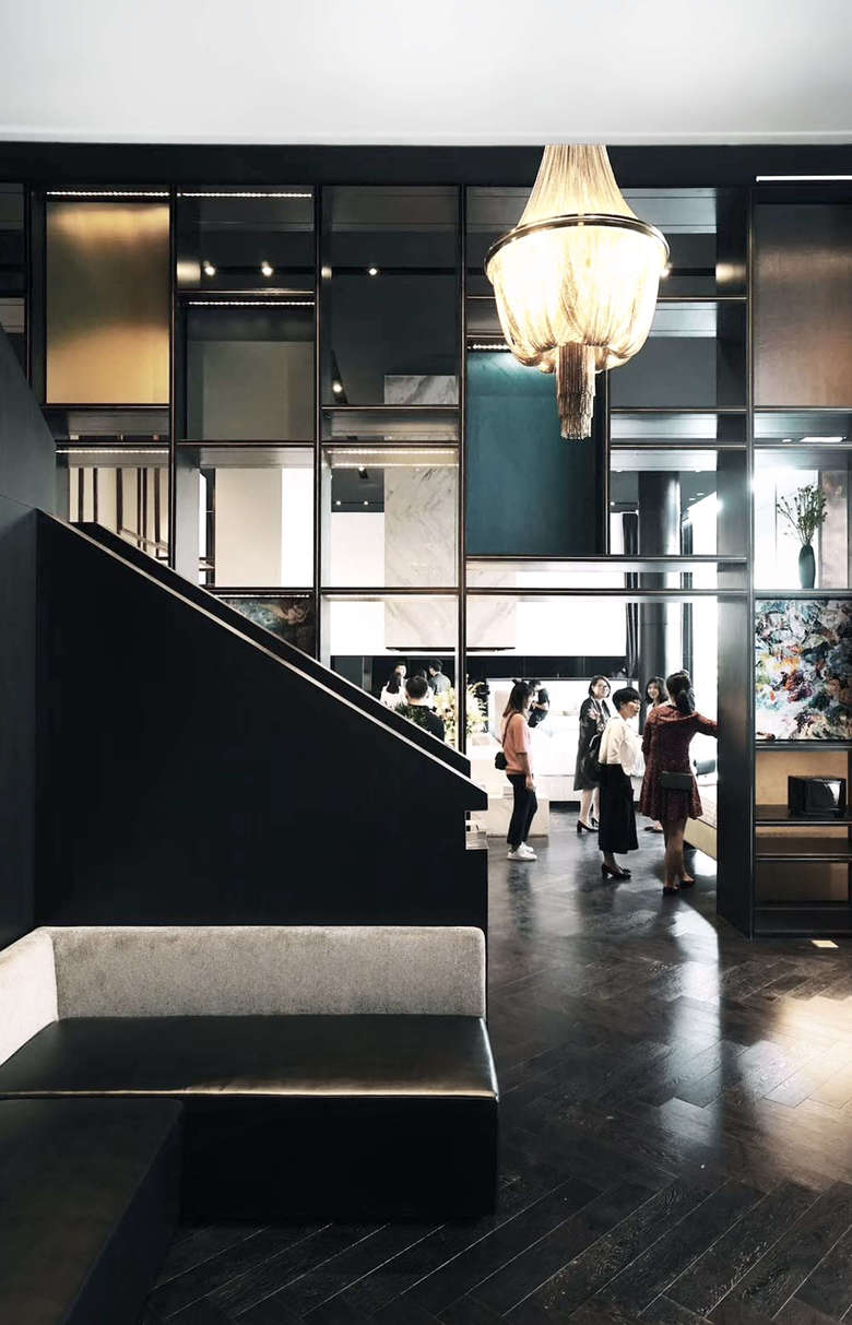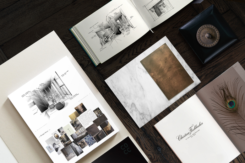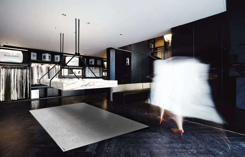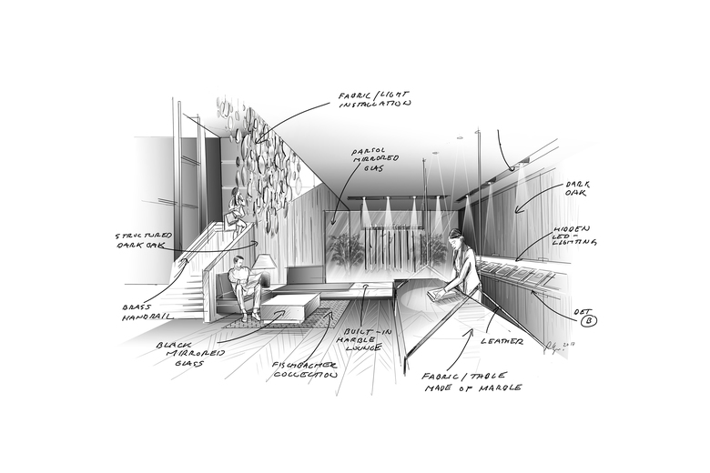 Our design story tells you a tale about the most beautiful materials, carefully craftet furniture and precious details. The impressive height of the new showroom will be enhanced by a built-in gallery floor. An immense monolith coated in parsol mirror glass will be dominating the architecture and hides simultanousely a lot of storage room. The desaturated colors are a perfect plattform for the beautiful Fischbacher Fabrics. Marble, oak, glass and brass are going to be combined to create an elegant and sophisticated atmosphere - translating the rich quality of the fabrics into the new interior design.