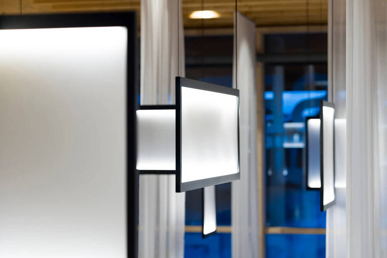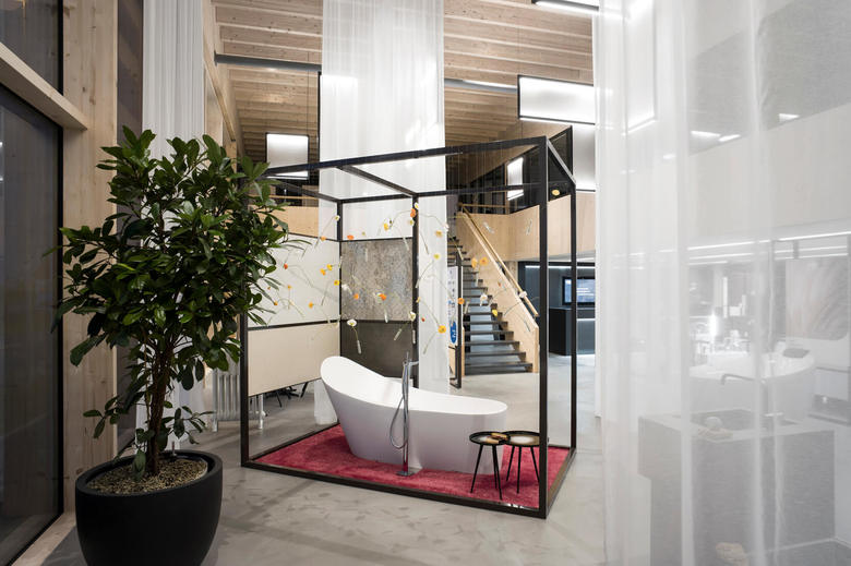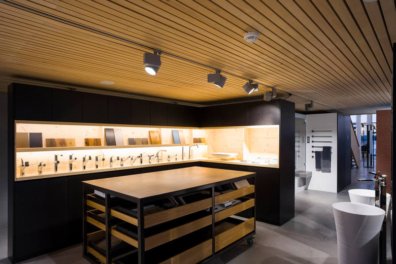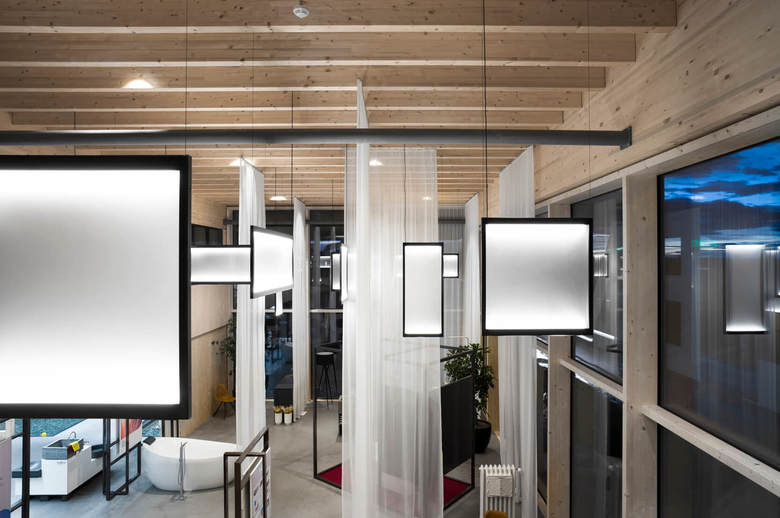 At the showroom‘s styling, architecture and interior design go hand in hand. Our concept for the sales area consists of a strong signage and a clear formal language. Specifically designed salesroom highlights and room-high curtains put the homely bathroom world of Eugster Sanitary Equipment in scene. A well-conceived lighting concept even communicates to exterior and street and can be adjusted to every season and weather.