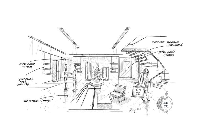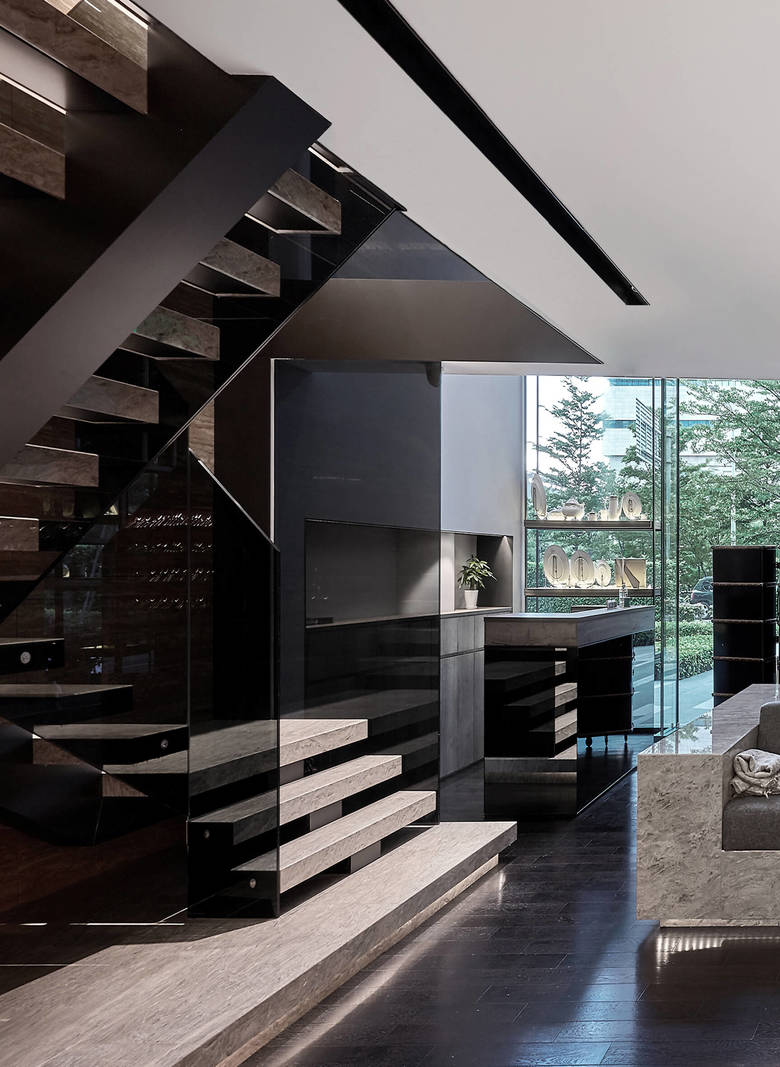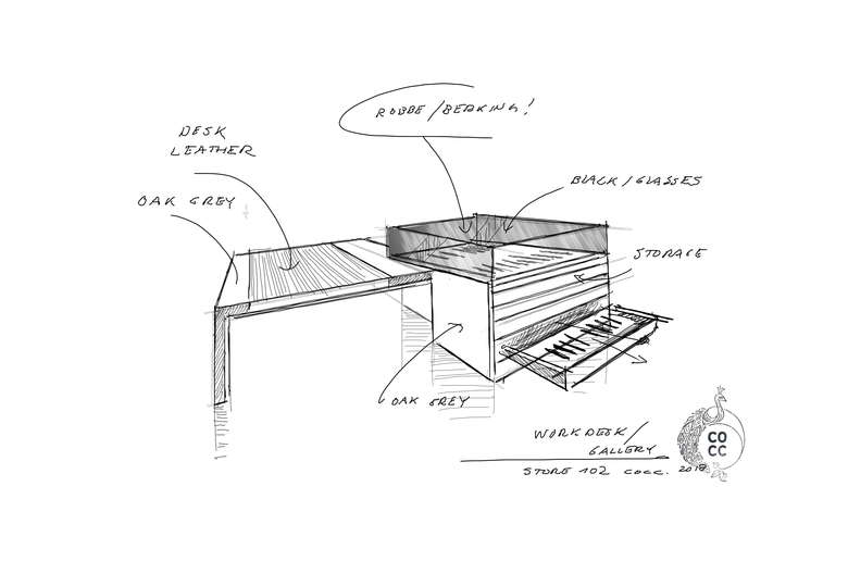 Both levels -ground floor and gallery- are linked with a generous stone staircase and a two story high display shelving unit.