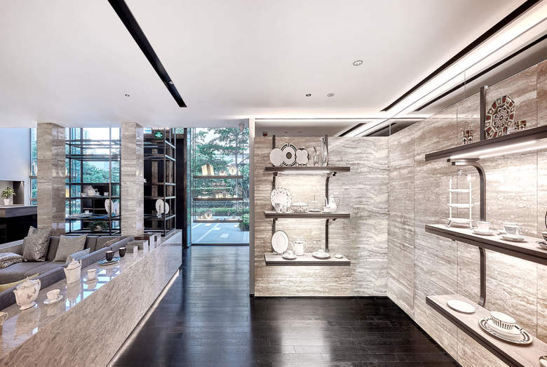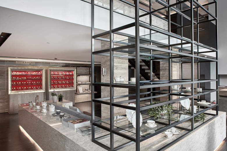 The luxurious and colorful world of Royal Crown Derby porcelain is asking for a neutral yet exclusive stage to display their functional and decorative tableware as ewll as porcelain gifts and collector pieces.