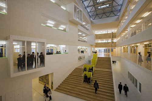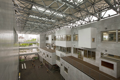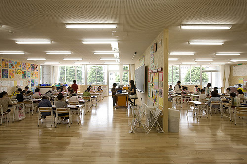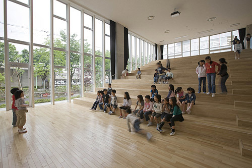 This inner-city campus links a junior high school and four consolidated elementary schools. Entitled “A Nine-Year Journey,” the campus was conceived as an embodiment of the children’s growth, with each of the sub-schools enjoying both independence from and connection to the others. A gently-curved 200-meter-wide strip of land sits between the road in front of the school and the Jinzukawa River, forming a rich landscape that lingers in the memory of anyone who visits. Sheltered by a large overhanging roof, the passage through the campus becomes a scenic space where students, teachers, and local citizens can interact naturally throughout the spring, summer, fall, and snowy winters.