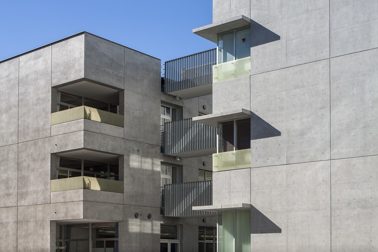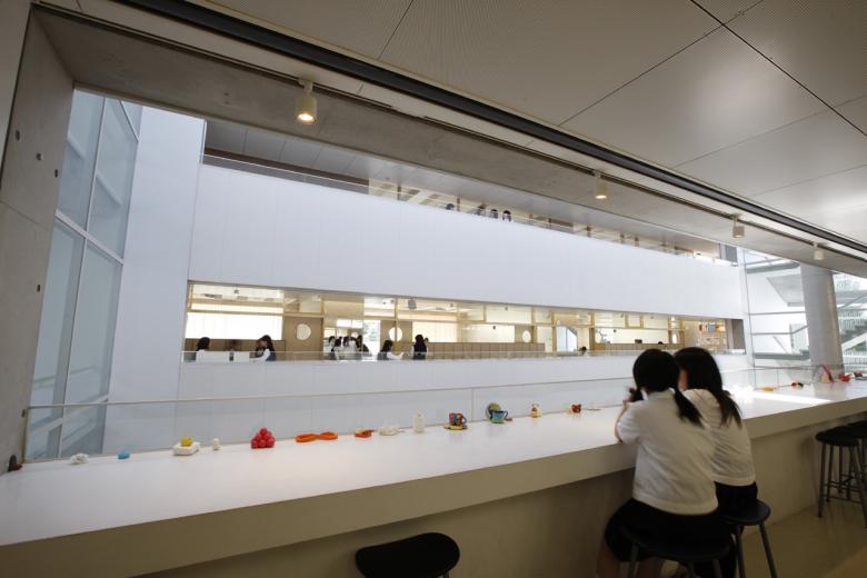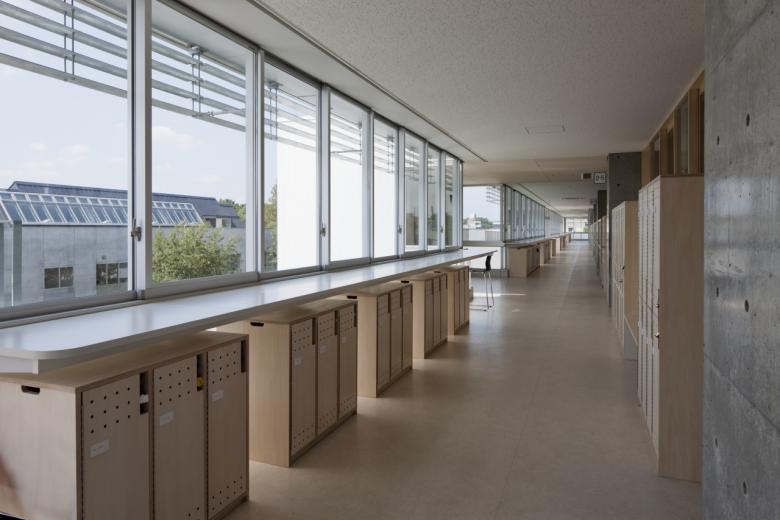 In this second of project, outside of the efficiently-arranged classrooms, we wanted to create a space that would be appealing for the students to spend time in. Previously the classrooms had been on the south side of the building, but we lined them up on the north side and put a hallway with lockers and counters on the south side facing the courtyard, resulting in a more open structure. A number of boxy volumes protrude 3.6 meters out from the hallway over the courtyard. Floating amid the trees, these "tree space" serve as terraces and centers for group activities.