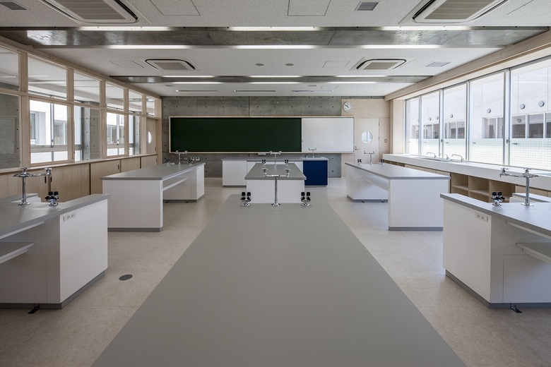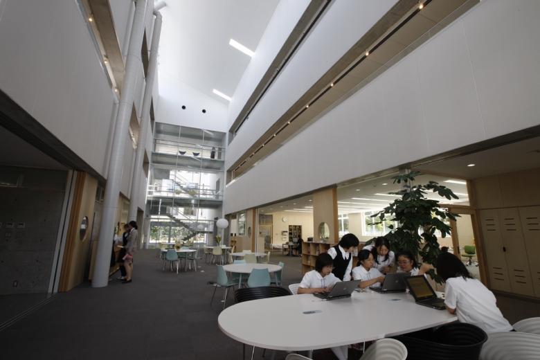 A redesign of a combined junior-senior high school located within a larger educational campus. Shiraume Gakuen Seishu Junior High School is the first stage of a plan to gradually reconstruct a number of linear school buildings making use of the void spaces interspersed between them. The school building was designed to symbolize a new educational philosophy called the “learning atrium,” in which students and teachers are able to interact freely in a series of classrooms arranged under a single roof around a large, multi-story open space. The whole structure is naturally warmed by sunlight and ventilated with windows in the top part of the building.
