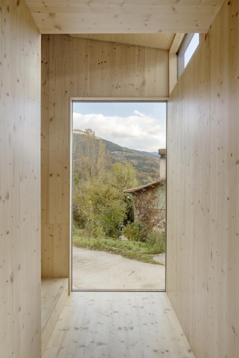 The lightness contrasts to the existing massif. The warm interior light welcomes you. The landscape floods the interior space, filtered by slats or framed in the staircase, so when you go up or down, the vision is distracted.