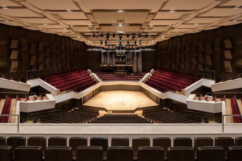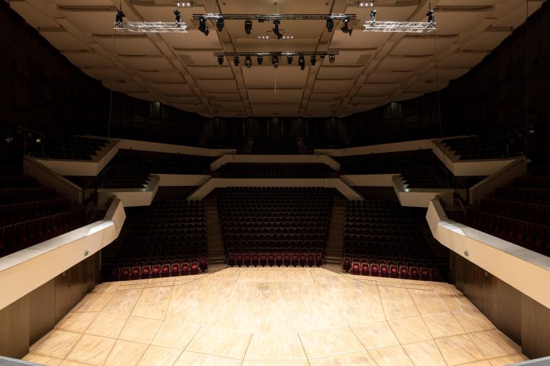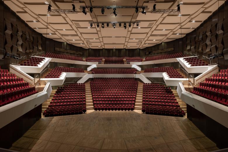 The audience area is also uniformly illuminated with rotatable and tiltable downlights with different beam characteristics. An illuminance level of 300 lx is achieved here. Downlights were added under the tiers to prevent the areas from being overshadowed by the lighting from the auditorium ceiling.