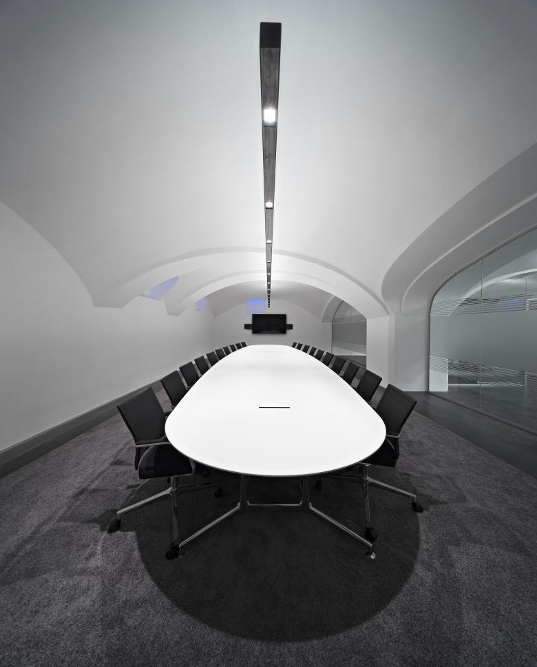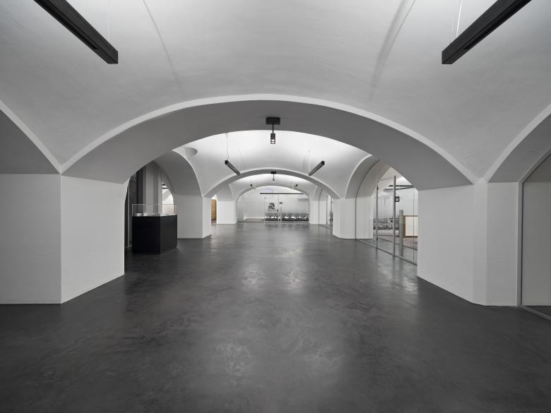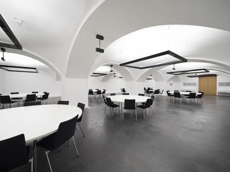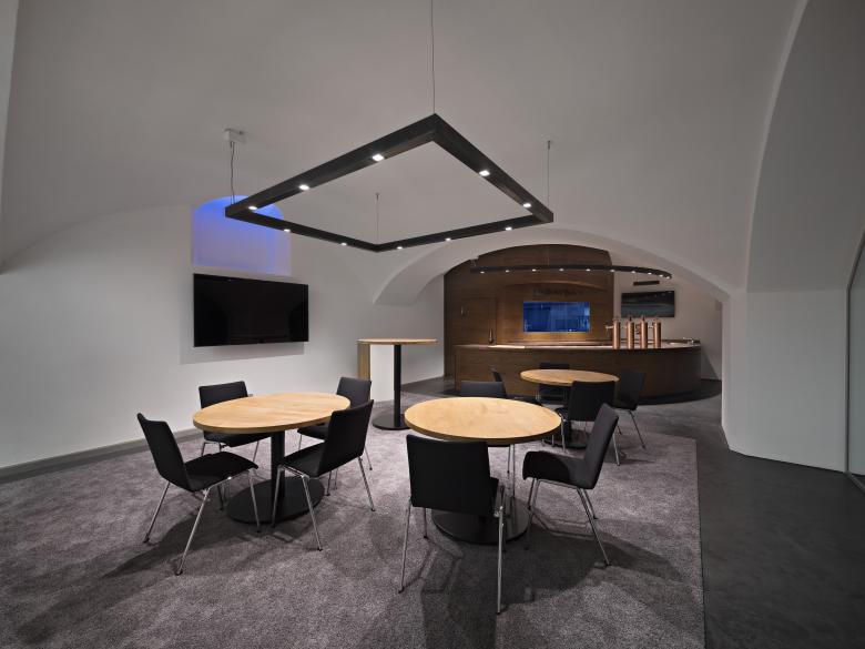 The historic vaults in the basement are unique for an administrative building. The Zacherlsaal as an event venue was the starting point for the lighting concept. Eight seemingly floating rectangular profile luminaires have proved to be the calmest form in the various vault geometries. Due to the low operating times and the high representative significance of the hall, we planned the direct component with specially developed reflectors to achieve a high brilliance and clear shadows in the lighting effect to achieve a festive atmosphere. The indirect components of the banquet light are equipped with LEDs to impart diffused illumination to each vault dome individually. We took care not to illuminate the intervening girdle arches. The architect invokes the old wooden beer barrels in the choice of materials with steel and oak, which was also continued in the luminaires throughout the historic section. One challenge was to adapt the dimensions of the luminaires to the respective different room dimensions. This required separate special planning. As the rooms in the vaulted cellar are separated by glass walls, the luminaires retain a visual reference to each other.