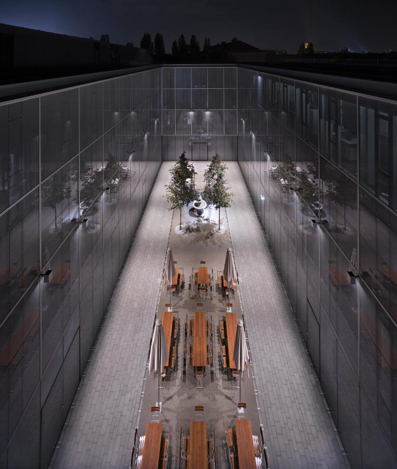 The inner courtyard in the basement is illuminated with sharp edges by 18 special surface-mounted luminaires. In addition, the Paulaner fountain is accentuated with two narrow-beam spots
