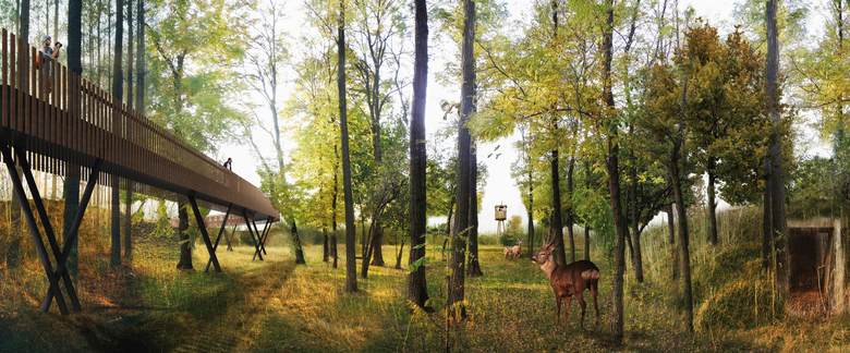 Riproponendo lo schema di protezione esistente della doppia recinzione, due terzi dell'area preserveranno intatta la loro impermeabilità al passaggio, mentre la parte più a sud sarà mantenuta aperta per fruirne liberamente; farà eccezione un lungo percorso sopraelevato che permetterà ai visitatori di osservare dall'alto, in un rapporto il meno possibile invasivo nei confronti del nuovo ecosistema. Per la stessa ragione il percorso si affaccia appena, come un trampolino panoramico, nell'area più a nord, senza però attraversarla: sarà quella infatti la zona di rinaturalizzazione massima, protetta da tutto il resto, con l'obiettivo di raggiungere la più alta biodiversità possibile.
