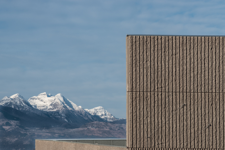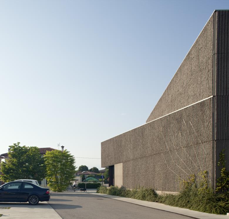 The risk one may run in adding a new commercial building in the centre of a small village is to subvert balances and prevail on the existing. This is intended to be a different kind of approach compared with the usual box-shaped shopping centre: an aggregation of volumes with different heights and rough concrete panelling attempts to confront with the old urban pattern. The massive presence of vegetation, both trees and climbers, is the unpredictable element guided by time and seasons as a moment of mediation.