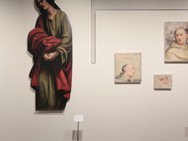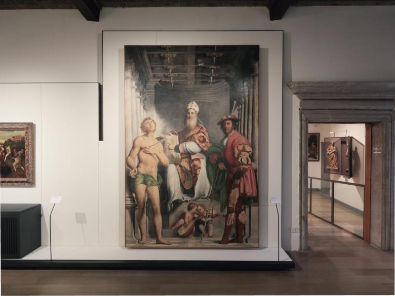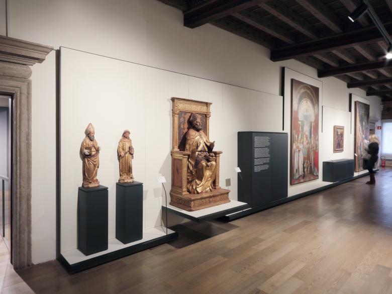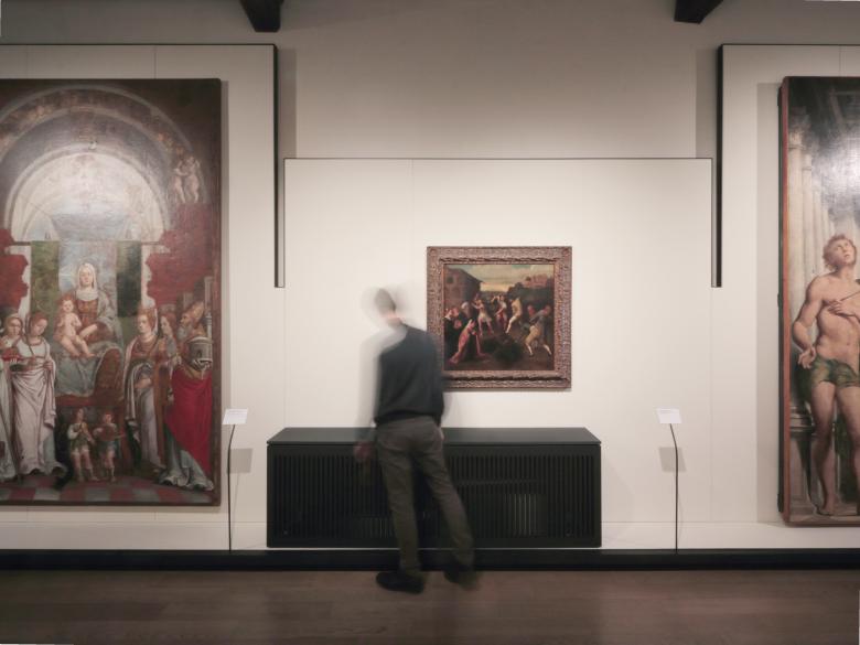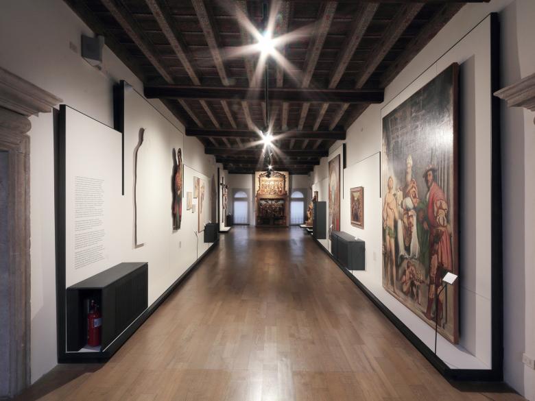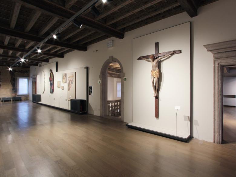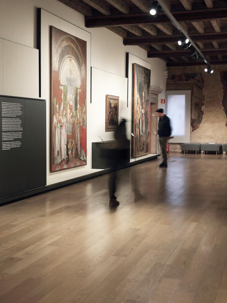 The former display in the hall of the Civic Museum was the product of successive layers which prevented a correct vision of the artworks. Therefore, the project works with lightness and subtraction: a thin and suspended base identifies the space for the collection, while the background follows their dimensions, rising and lowering as needed. The very fine-grained plastering in light hue of the new display machine brings out the works of art in their material and chromatic complexity, allowing them to rise as leads of the action.