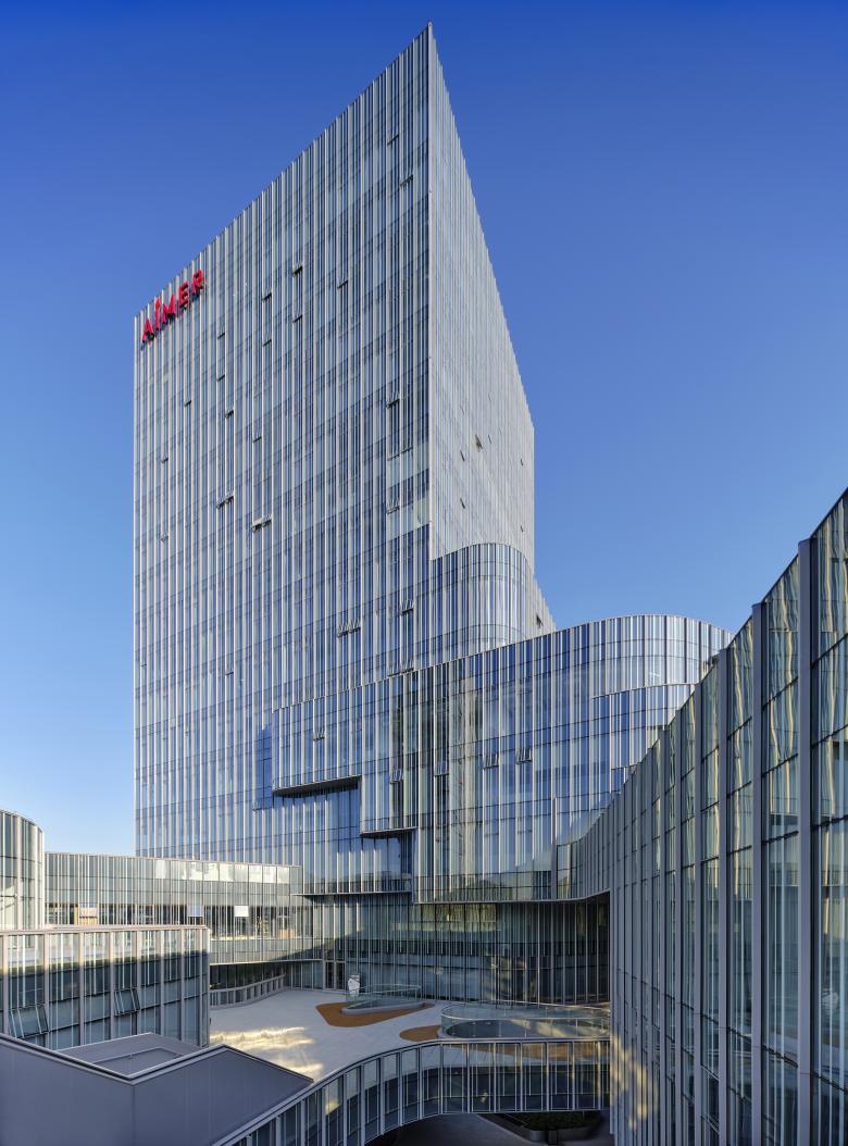 The Aimer Suzhou Headquarters integrates a diverse range of functions. The combination of Commercial areas, outlet, offices, live streaming, hotel, conference functions, multifunctional hall, and VIP reception, complete a building that caters to business travelers, shoppers, and creative professionals alike.