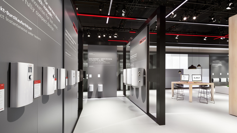 "Clear line" is the name of Stiebel Eltron's new brand campaign. And this line dominates the new stand concept. It was the central element of the overall design.