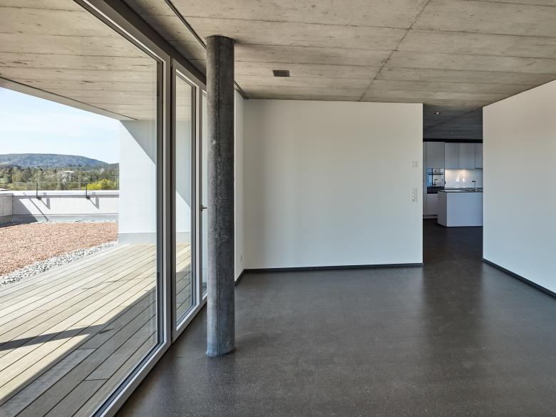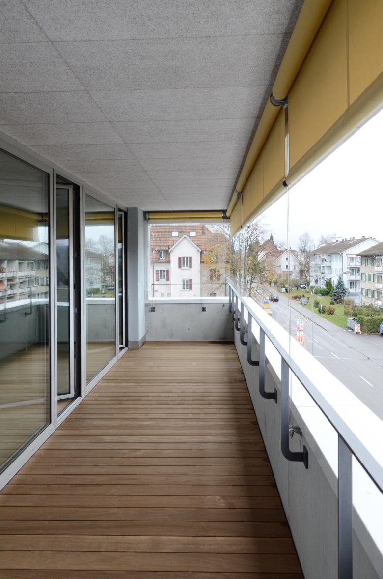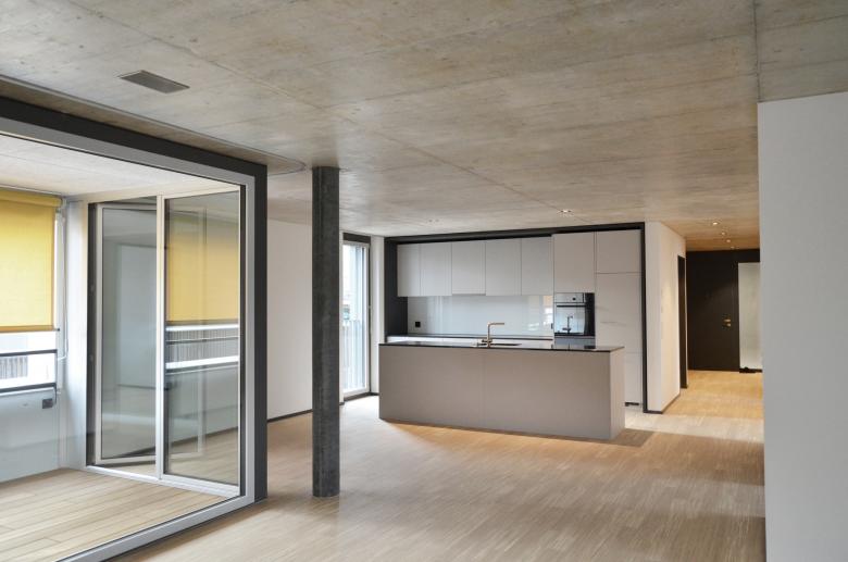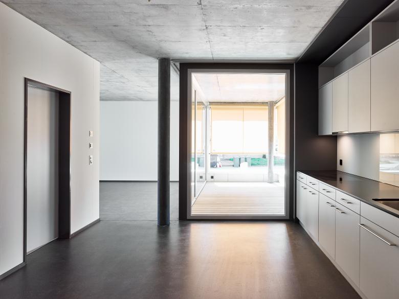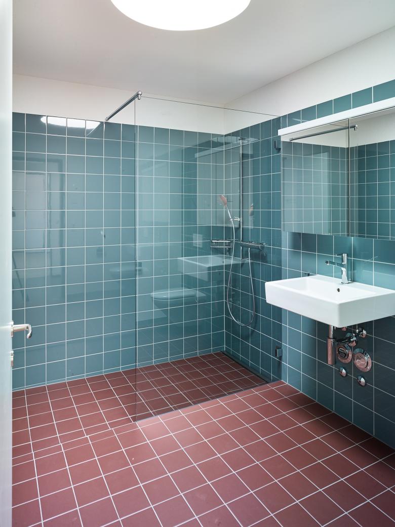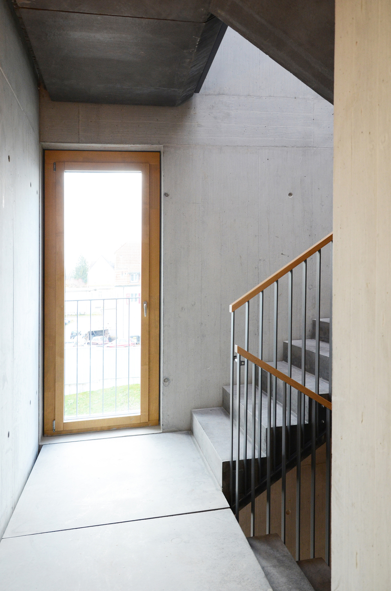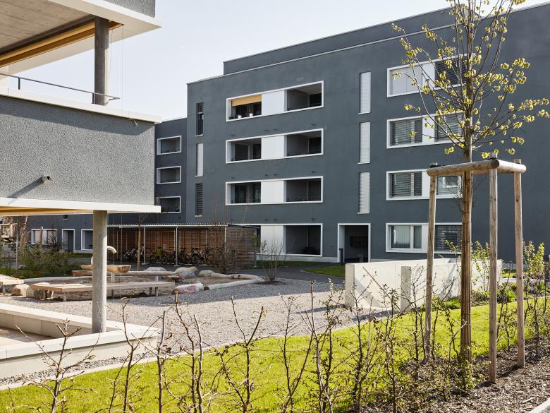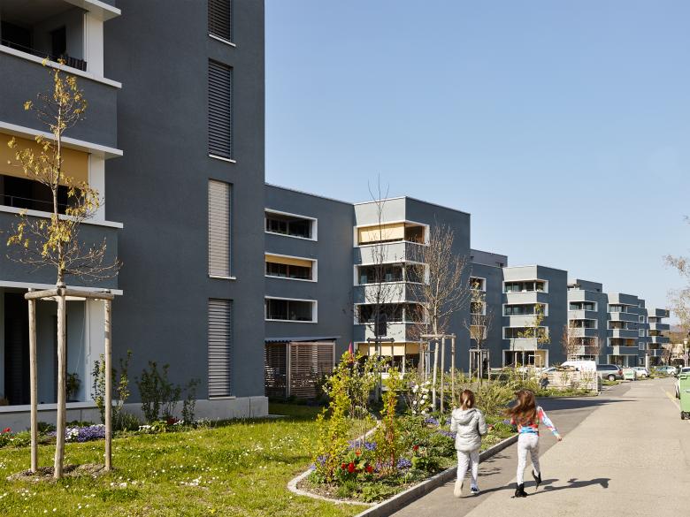 Schiffen gleich legen die Häuser mit akzentuierter Kopfausbildung entlang der Kasernenstrasse an und unterstreichen deren Adressbildung. In den zwei- bis vierspännigen Häusern werden gesamthaft 74 Wohnungen und ein Gemeinschaftsraum untergebracht. Die Fassade wird mit einem petrolfarbigen, mineralischen Kratzputz ausgebildet. Metallene Zargen umfassen die Fenster sowie die Balkoneinschnitte und akzentuieren die Präsenz der genossenschaftlichen Siedlung an einem Ort, der bislang keiner war.