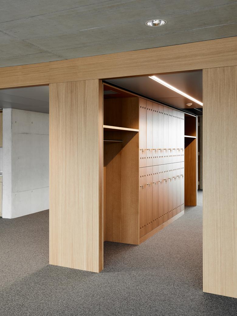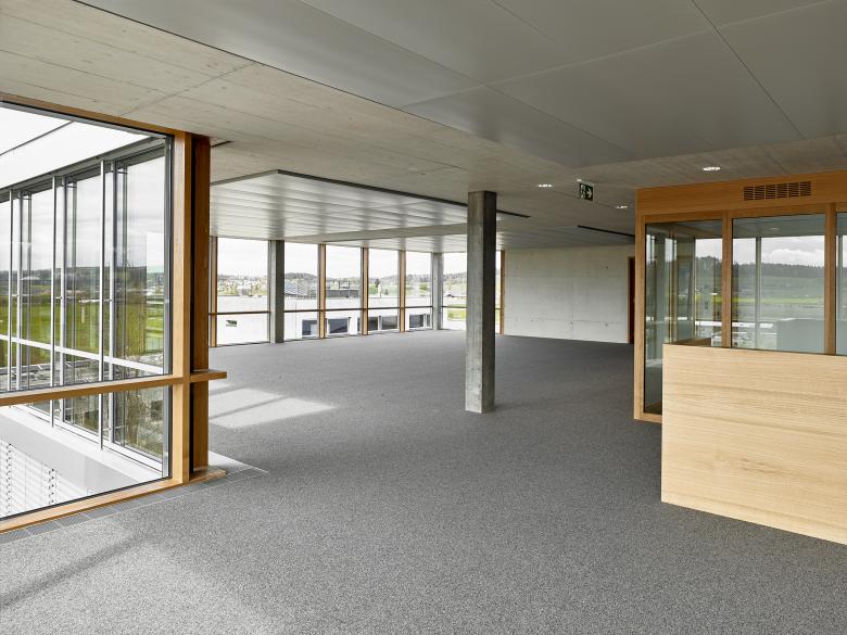 Der Innenausbau erzeugt mit den Eichenholztrennwänden und Einbauten, dem dunklen Nadelfilzhohlboden, den Kühldeckenelementen aus Aluminium und der Pfosten-Riegel-Fassade in Holz-Metall einen wertigen und reduziert gestalteten architektonischen Ausdruck, der dem progressiven Geiste des Ausbildungszentrums angemessen Rechnung tragen soll.