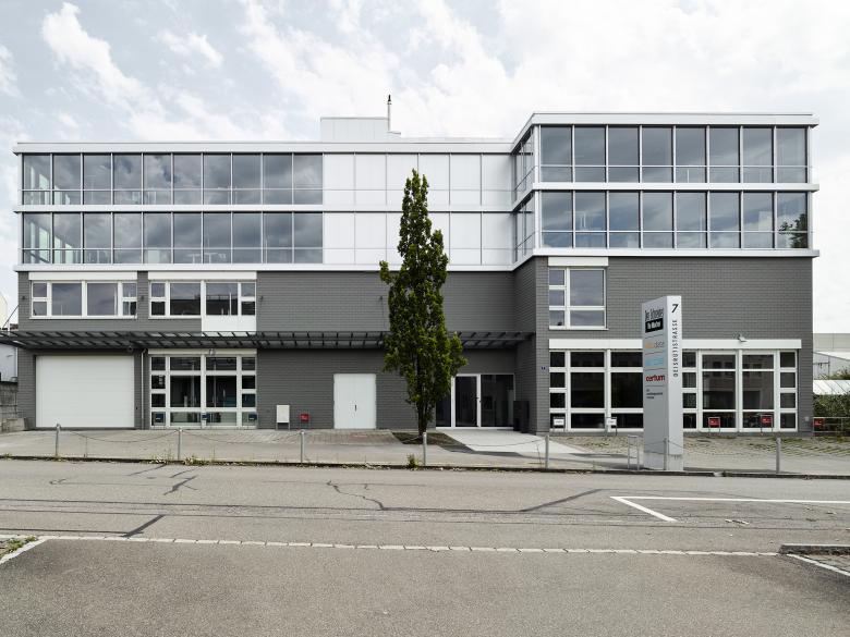 Ein filigranes und transparentes, zweigeschossiges Volumen wird auf den Unterbau aufgelegt. Die Logik des bestehenden Tragwerksystems aus Treppenhauskern, Stützen und Betondecken wird konsequent weitergeführt und bezüglich Erdbeben ertüchtigt. Eine feingliedrige, raumhohe Holz-Metallfassade umhüllt das neugeschaffene Volumen. Die eloxierten Aluminiumprofile erzeugen einen technischen und rationalen Ausdruck, welcher sich gleichzeitig vom pragmatisch gestalteten Unterbau der 1990-er Jahre als architektonische Intervention abhebt. Kontrastierend dazu werden die bestehende Eternitschindeln des Unterbaus dunkel gestrichen, wodurch die Aufstockung und der Unterbau zu einer gestalteten Einheit zusammenfinden. Die Vordachkonstruktion wird optisch zu einem Element zusammengefasst, konstruktiv weitergeführt und farblich auf das neue Erscheinungsbild abgestimmt.