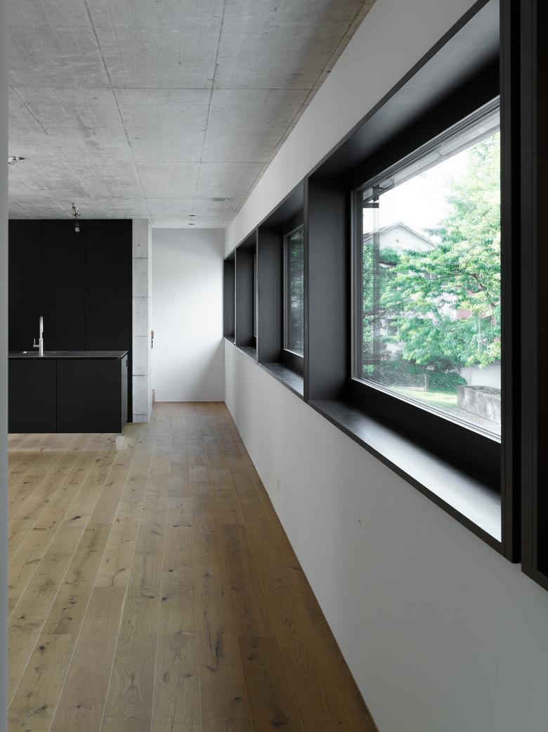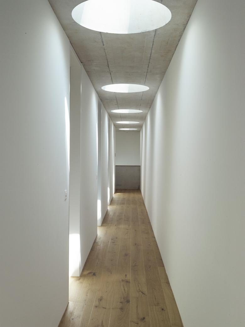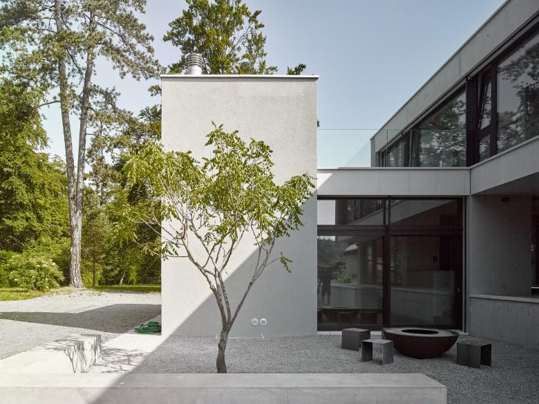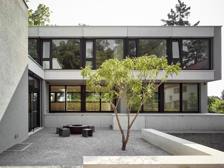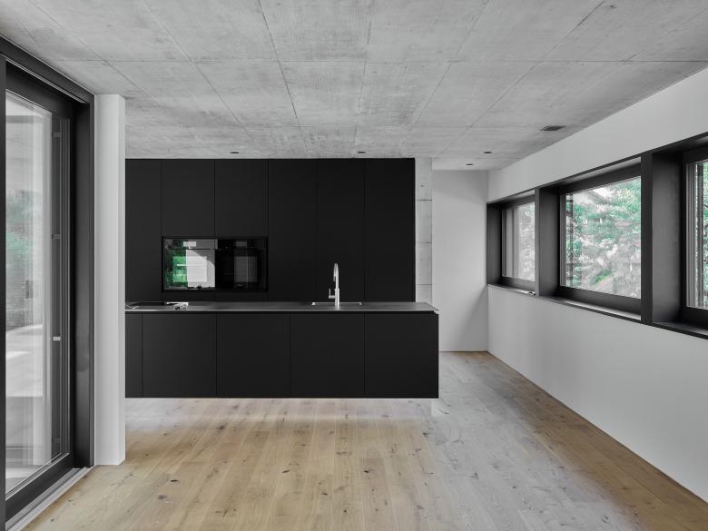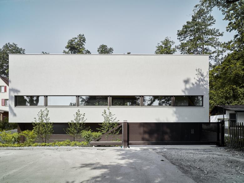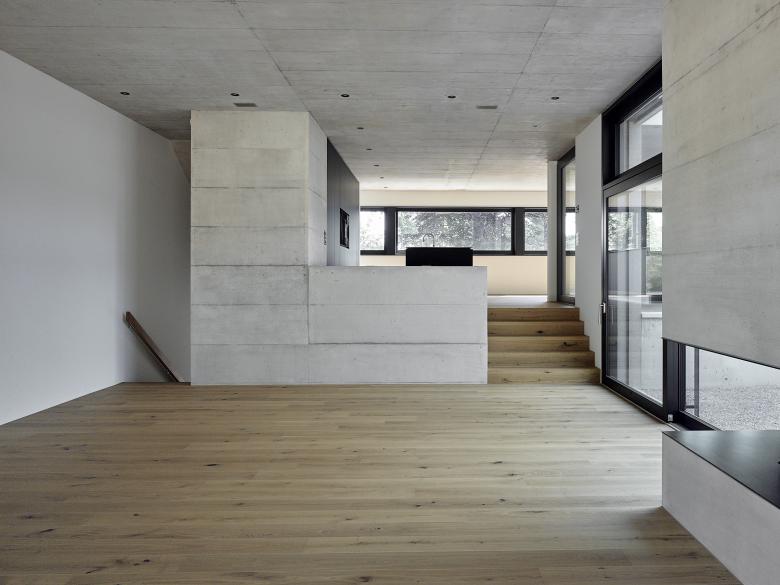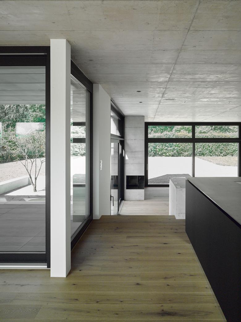 Der kubisch gegliederte L-förmige Baukörper formt, zusammen mit den Nachbargebäuden, nach Südwesten hin einen Hofartigen Aussenraum. Nach Nordosten kragen zwei Geschosse über einer Vorplatzsituation und markieren so einen Sockel in dem der Gebäudezugang, sowie die Garage platz finden. Das nach Westen leicht ansteigende Gelände wurde genutzt um über ein Splitlevel von Eingangsbereich in die ebenerdige, 3.5 Meter hohe Wohnhalle und aus dieser in den um einige Stufen erhöhten Koch- und Essbereich zu gelangen. Das fliessende Raumgefüge der Wohnräume wird dabei durch die zwei Sichtbetonkörper des Kamins und der Küche geprägt.