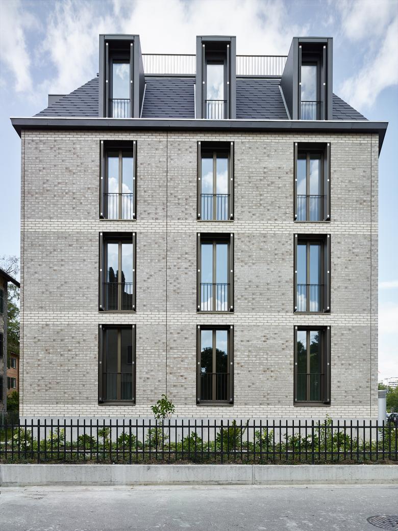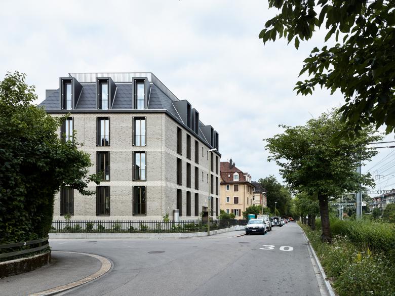 Der abgewinkelte Baukörper definiert die Strassenecke Bahnstrasse – Friedenstrasse ortsbaulich. Das Gebäude wird in Sockel, Hochparterre und zwei Normalgeschosse gegliedert und erhält als Abschluss eine auf das abgewalmte Mansardendach aufgesetzte Dachzinne. Schlanke Lukarnen gliedern die steile Dachfläche und erzeugen einen eleganten Ausdruck. Raumhohe Fenster mit französischen Balkonen und feinen Faltklappläden erzeugen ein hohes Mass an Ordnung und bringen Ruhe in die Fassade. Die Materialisierung der Fassade