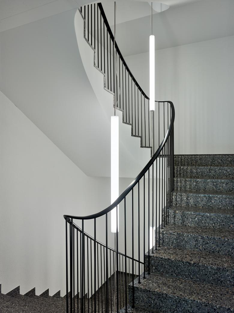 zweispännig konzipiert. Eine hohe Eingangshalle empfängt die Bewohner. Der Höhenunterschied zum Hochparterre wird über eine kurze einläufige Verbindungs-
