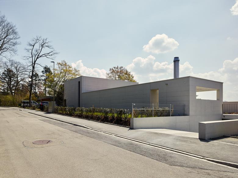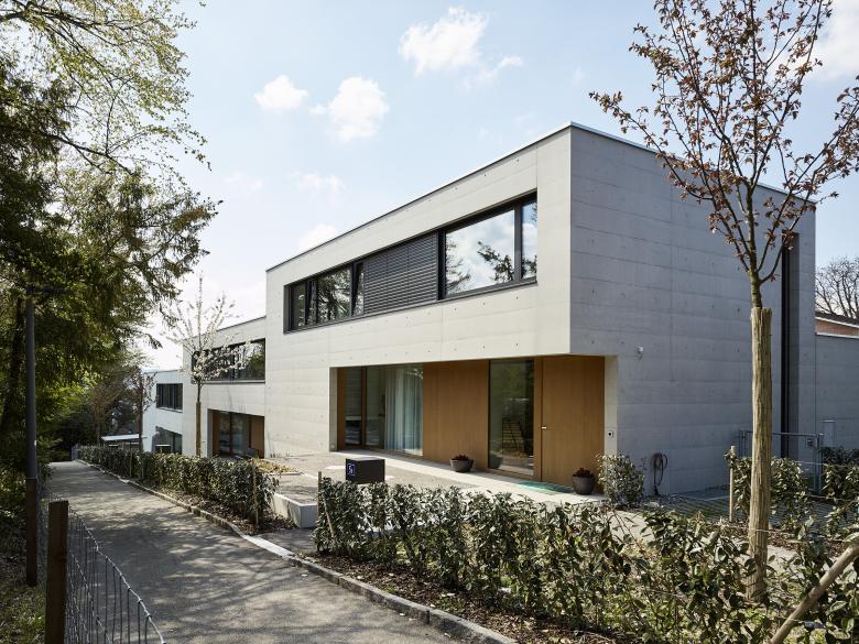 Die Abstufungen der Gebäudevolumen erlauben einen Fernbezug, gewähren aber vor allem eine maximale Privatsphäre der Häuser und ihrer Aussenbereiche. Die kubisch gestalteten Gebäudekörper in Sichtbeton mit spezieller Kiesmischung zeichnen den Geländeverlauf nach und geben ihnen darin den notwendigen Charakter. In das Betonvolumen eingeschnittene Einkerbungen markieren die Zugangsbereiche.