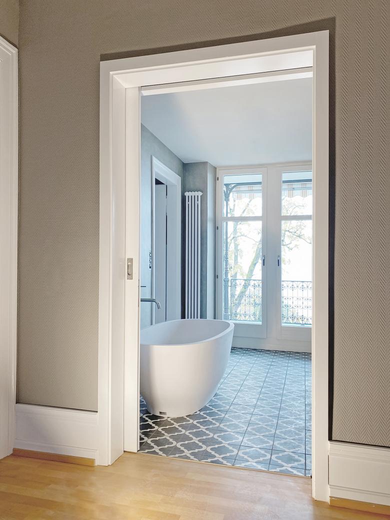 Die neuen Einbauten wie etwa die interne Verbindungstreppe, die Küche und Ankleideschränke wurden als Mobiliar entworfen, um der Verschmelzung zeitlich und baulich verschiedener Eingriffe entgegenzuwirken. Im Bereich der ehemaligen Küche im 1. Obergeschoss wurde ein Bad eingebaut mit herrlicher Sicht auf den Zürichsee.