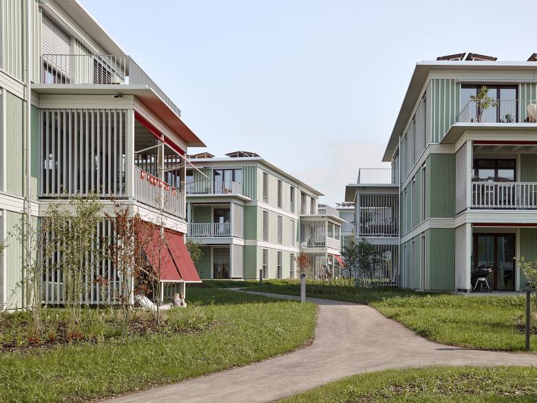 Die Gebäude weisen bezüglich ihrer Grösse alle die gleichen Grunddimensionen auf. Flügelpartien an den Ost- oder Westseiten sollen den Gebäuden eine Ausrichtung geben und optimale Besonnung und Belichtung der Wohnungen ermöglichen. Als einleitendes Gebäude erhält das Auftaktsgebäude zwei versetzte Flügelpartien die das räumliche „Strickmuster“ initiert. Alle Häuser sind vierspännig erschlossen und auf einem auf die Holzelementbauweise abgestimmten Gebäuderaster aufgebaut. Der Gebäudeaufbau ist gleich einer Zwiebel konzipiert. Der innere Kern wird in Beton erstellt, übernimmt aussteifende Wirkung und beherbergt das gesamte Erschliessungssystem. In einem zweiten Ring werden alle dienenden Räume wie Nasszellen, Entrées, Küchen und Réduits eingeschrieben, im dritten Ring werden alle Wohnräume untergebracht. Abschliessend übernimmt ein fragmentarischer, vierter Ring die Balkonelemente, welche als eigenständige Konstruktionen vor die Gebäudekörper hingestellt gelesen werden sollen.