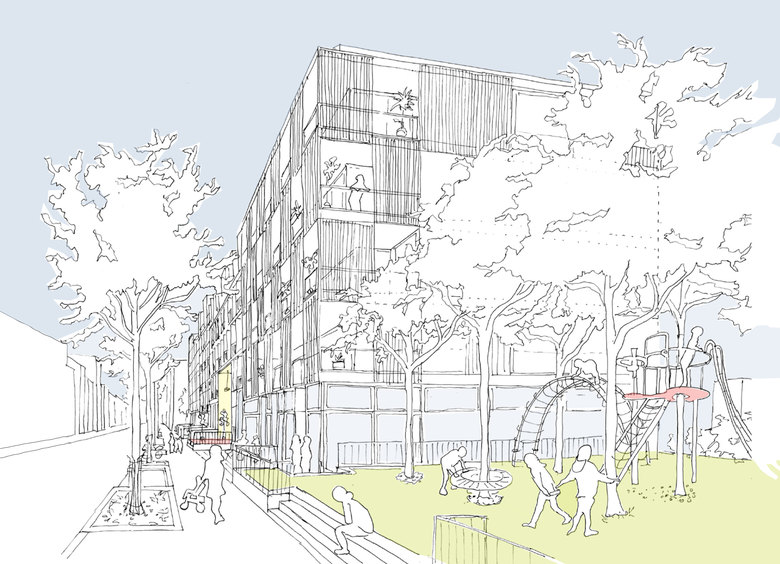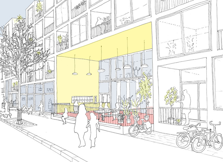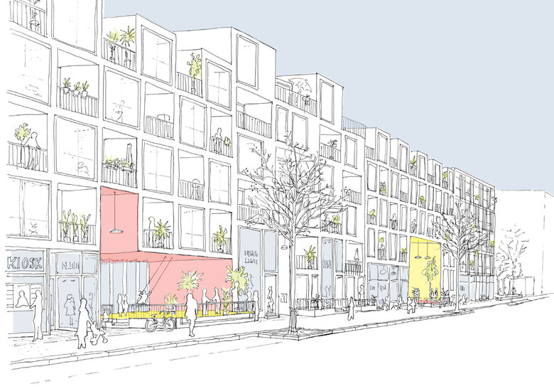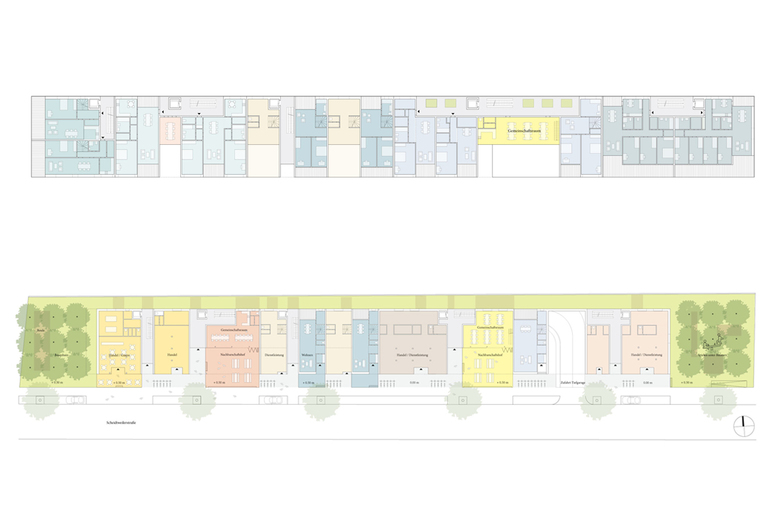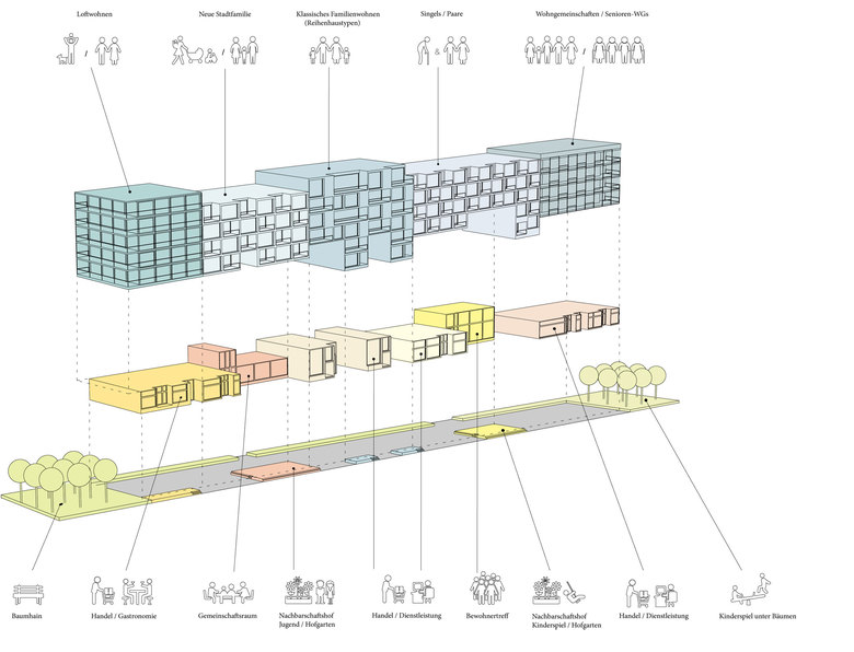Weiterentwicklung von Bestandssiedlungen in Köln – Das Langhaus Köln setzt sich aus zwei Elementen zusammen; einem „urbanen Sockel“ und einer Abfolge verschiedener „Wohncharaktere“, die sich auf dem Sockel aneinanderreihen. Der urbane Sockel greift eine Vielzahl vitaler, urbaner Funktionen des Stadtteils auf, die die Erdgeschosszone beleben und menschliche Interaktion ermöglichen: Neben Flächen für Handel, Gastronomie und Dienstleistungen, finden sich im Sockel diverse Funktionen, die dem nachbarschaftliche Zusammenleben dienen. Der Sockel umfasst zwei Nachbarschaftshöfe, die, ähnlich wie der Hof eines Geschosswohnungsbaus, als Treffpunkt und zentraler Kommunikationsraum dienen. Diese halböffentlichen Außenräume sind vielseitig nutzbar; sie bieten Raum für Begegnungen, Kinderspiel, Hausfeste, Jugendliche, gemeinschaftliche Beete und Pflanzen und vieles mehr. Sie ermöglichen eine Interaktion zwischen den Bewohnern und dem öffentlichen Raum. An die Höfe grenzen unmittelbar Gemeinschafträume an – der Außenraum ergänzt im Sommer den Innenraum.