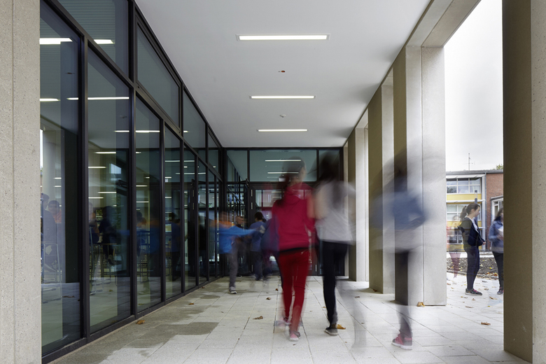 Der Speisesaal der Mensa kann mittig geteilt werden und lässt so eine zeitgleiche Nutzung beider Teile zu. Die Trennung ist so konzipiert, dass bei geschlossener Trennwand beide Nutzungseinheiten ohne funktionale Einschränkung über den Vordach- und Windfangbereich zugänglich sind. Neben dem Mensabetrieb auf halbierter Fläche, ist zeitgleich die Nutzung des anderen Teils als Aufenthaltsraum für die Oberstufe möglich, dem auch ein Kiosk zugeordnet ist.