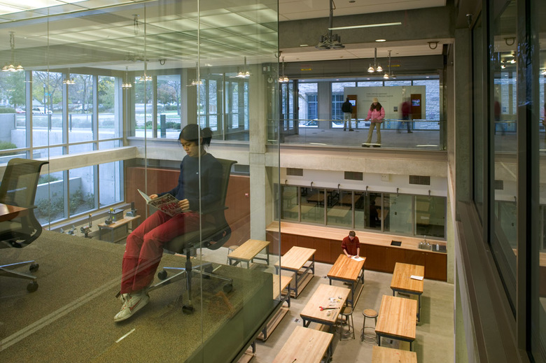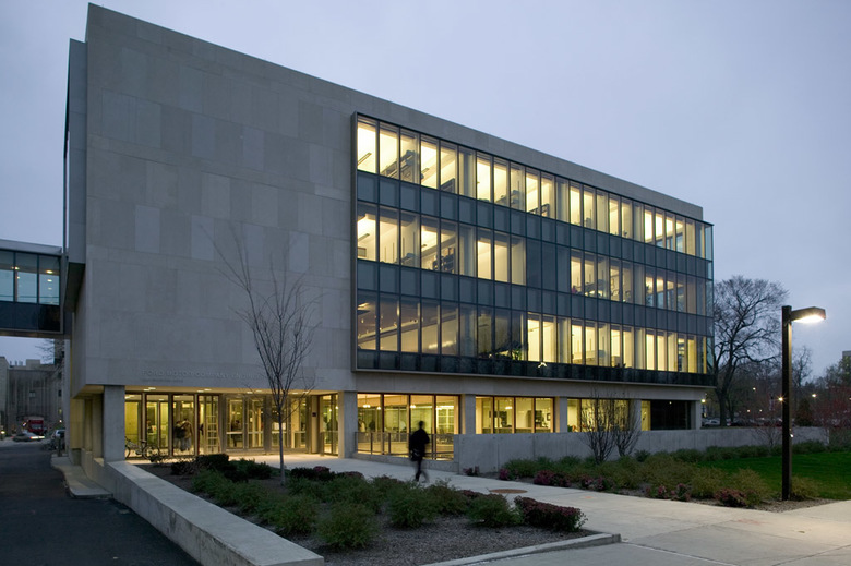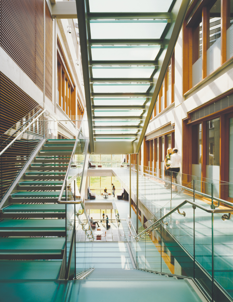 Northwestern University’s Ford Motor Company Engineering Design Center is the focal point of the Robert R. McCormick School of Engineering and Applied Science’s initiatives in design education. The facility provides resources for interdisciplinary, undergraduate engineering education. The building was programmed and designed to eliminate traditional departmental boundaries to focus on the integration of spaces for the Mechanical, Civil, and Biomedical Engineering Departments and the consolidated Electrical Engineering and Computer Science Departments. The state-of-the-art facility houses a centralized student machine shop, rapid prototyping facilities, biomedical/chemical engineering labs, a mechatronics lab, a CAD/CAM lab, studio classrooms, design fabrication and assembly spaces, a lecture hall, an automobile testing section and project display areas. Team meeting rooms and study space support collaboration, interdisciplinary work and an increasing reliance on information technology. A sky-lit glass-walled atrium interconnects floors visually and further encourages team-based learning.