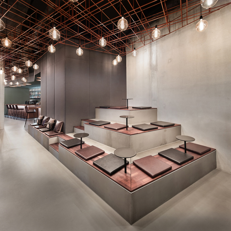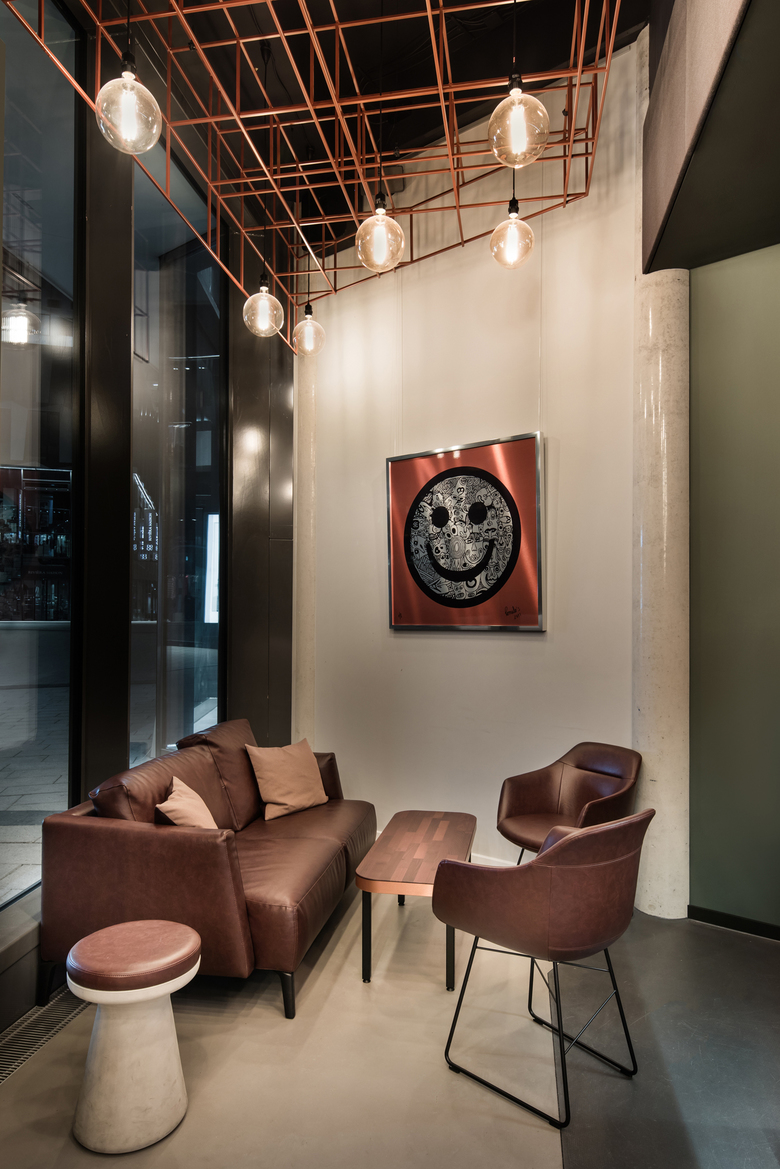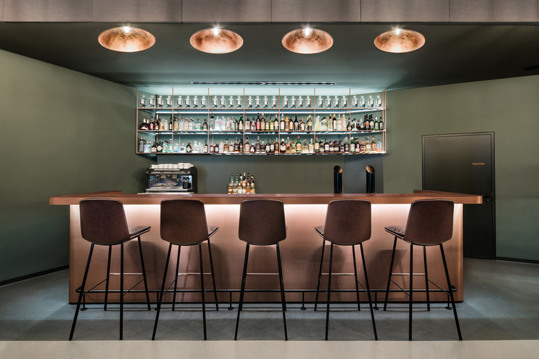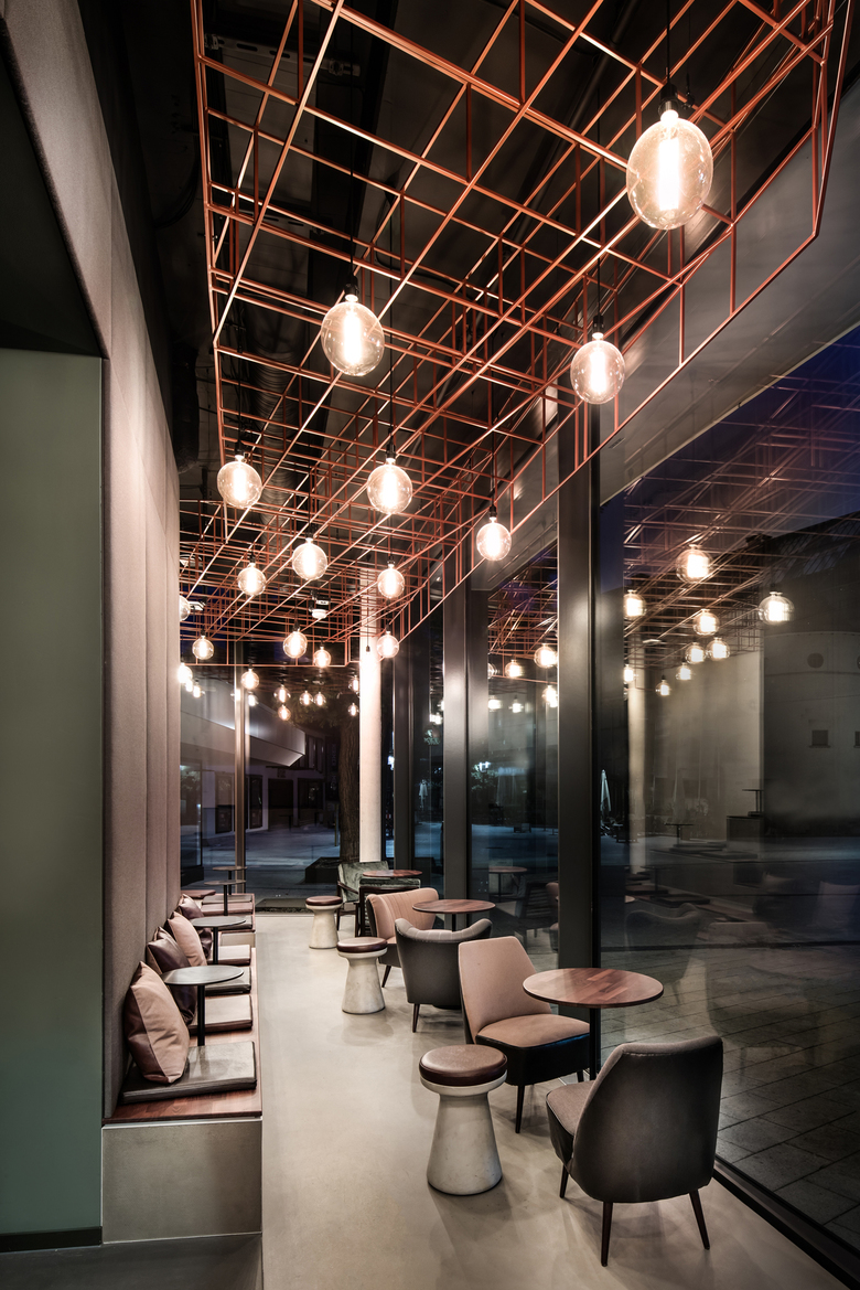 When night falls, the defining copper tones, highlighted by shades of patina and the reflection of lights, create a one-of-kind ambience that glows invitingly when seen from outside. The bar becomes a welcoming, stand-alone feature. The rust-brown shelving accentuates the luminescent bottles of spirits and the hand-crafted iron lamps in the suspended ceiling become stylish overhead lights. The striking ceiling installation, consisting of delicate, angular rods and eye-catching bulbs, completes the picture.