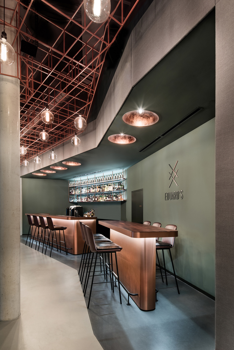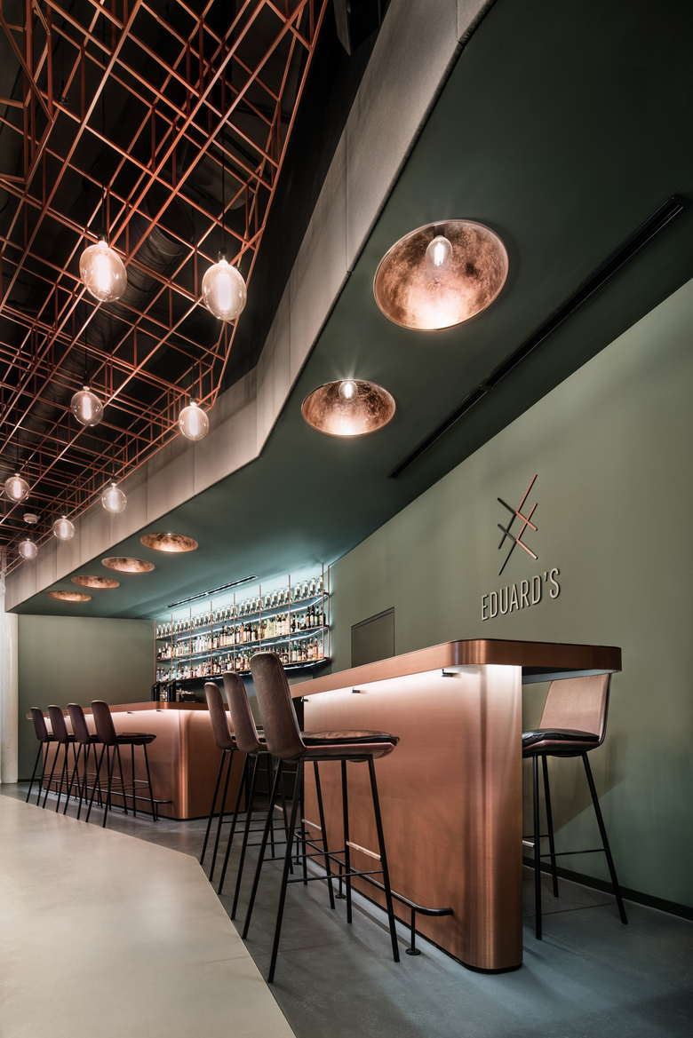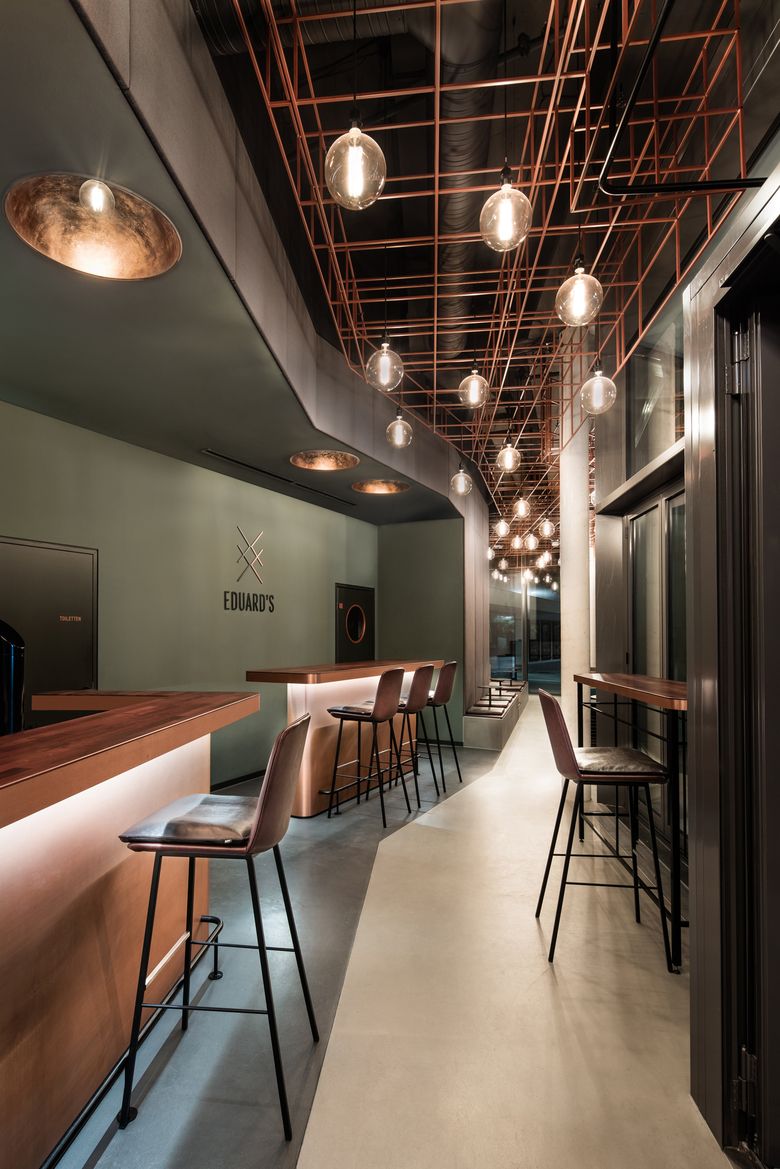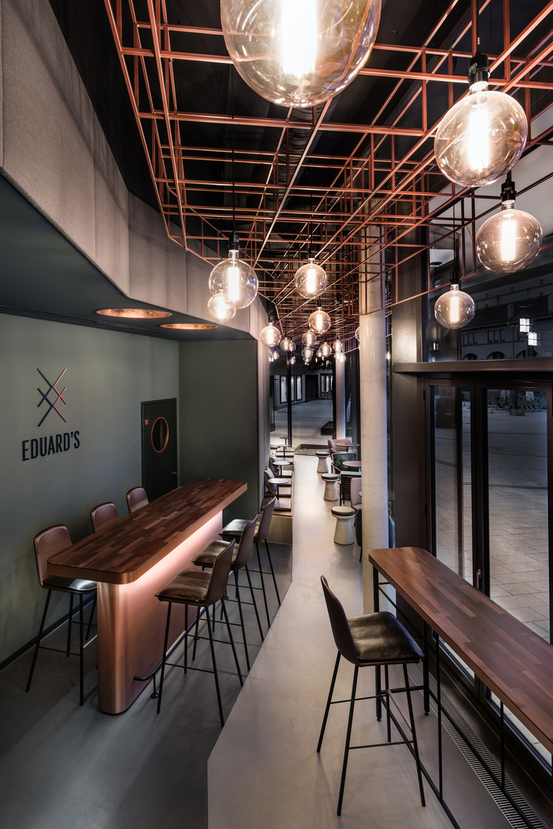The elegant character of the metal serves as a contrast to the raw industrial floor and the exposed concrete walls. Wall design elements and textiles in muted green tones, dark wood and rustic leather upholstery complement the colour and material concept. The corporate design infuses every detail. The name and logo unite tradition with the modern age and are indicative of the timelessness of elegance, which is realised across the different eras. The geometric design reflects the structure of the ceiling installation and is emphasized by a bold and streamlined typeface: Welcome to Eduard’s!