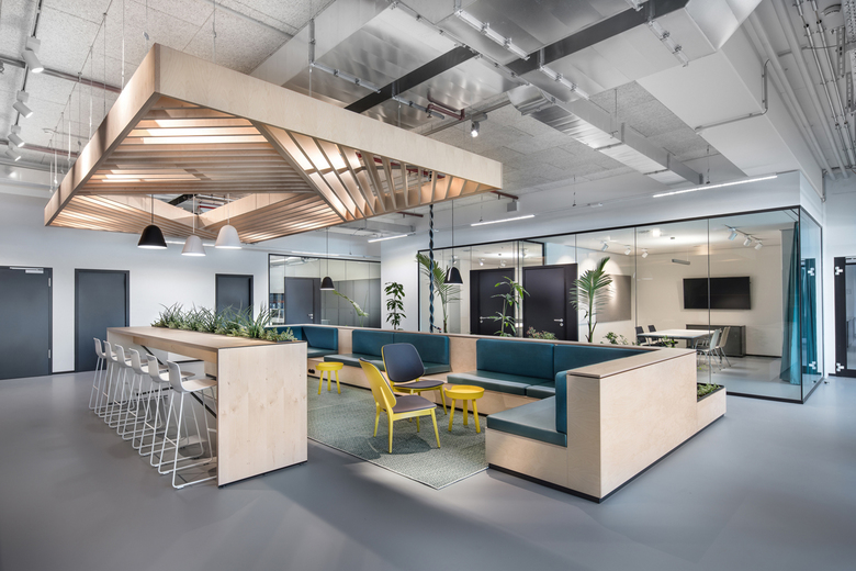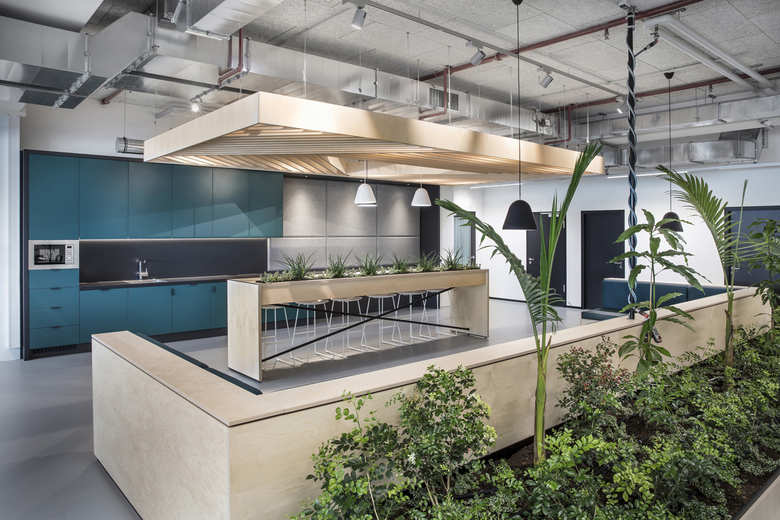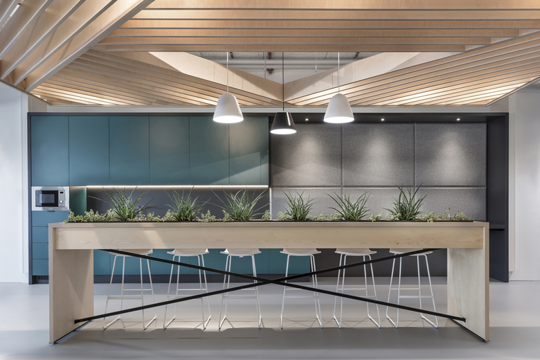Transferring the identity of a company into the space means creating a suitable framework for the lived corporate culture. The design concept takes up the cool, rough look of the logistics building and, combining it with cozy, friendly details, creates a loft-like office atmosphere. Band windows were integrated into the partition wall between the office area and the high-rise warehouse. These allow a view into the latter and create a strong identification with the product and so with the company itself. A high-quality matt gray epoxy resin floor melds the entire surface into one unit. This clean look is contrasted in the open space area by the exposed technical ceiling. Textiles and friendly accents in shades of green and yellow refer to the company’s relationship to nature and, in particular, create a homely atmosphere in the communication zones. Numerous in-house plants of the company round off the feel-good mood.
