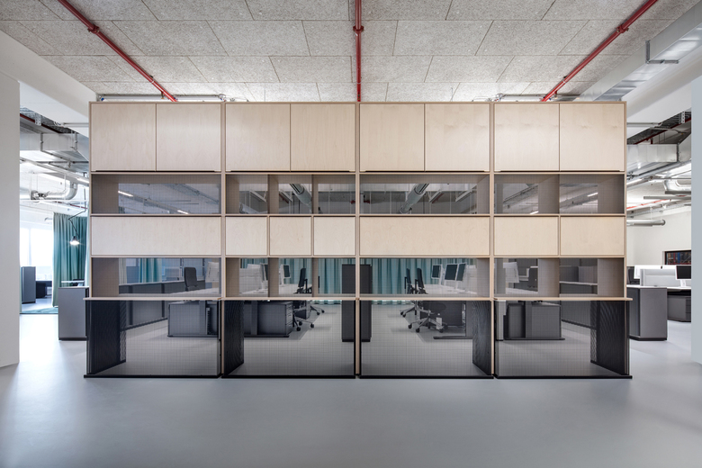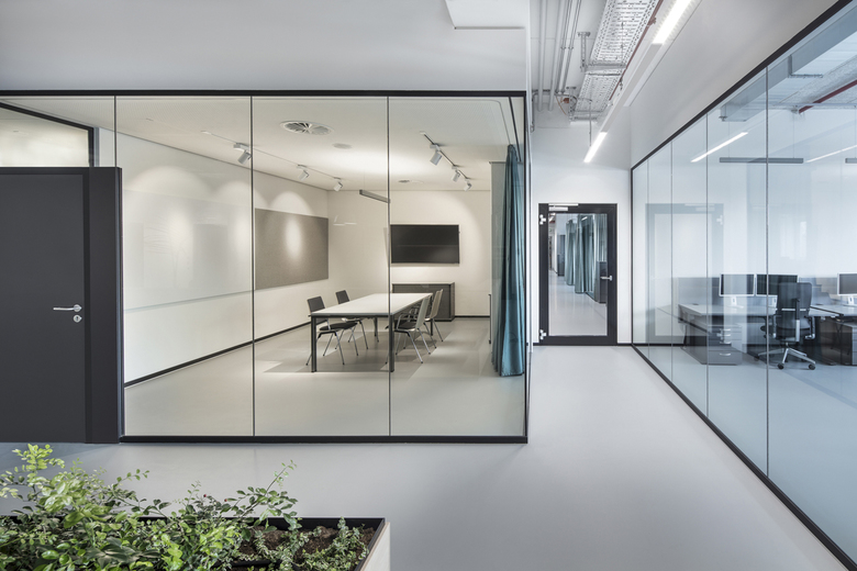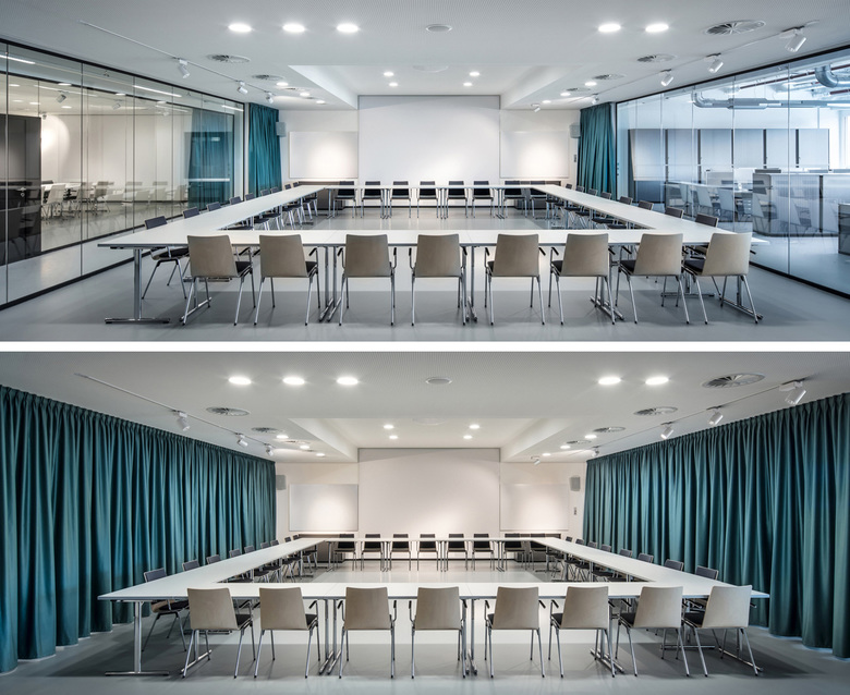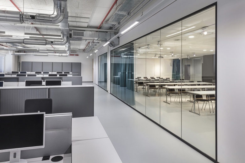 The entry of daylight through the existing strip facade is optimally exploited by glass separation systems. The lighting concept with predominantly linear pendant luminaires uses energy-saving LEDs, while in the hall area it falls back on existing, upgraded luminaires. Playful cantilever-arm lights are used as design elements in different zones. To integrate the technology, the planners oriented themselves around the existing system and also developed a technology platform for the ventilation unit. Special attention was given to the cold- and noise insulation of the floor and to the partition walls separating the office space from the high-rise warehouse. In the room, acoustic panels on the ceiling and deployed as design elements on the walls ensure that the room acoustics are balanced and appropriate. The symbiosis of all the architectural and design solutions creates a balance between space-efficiency, functionality and quality.