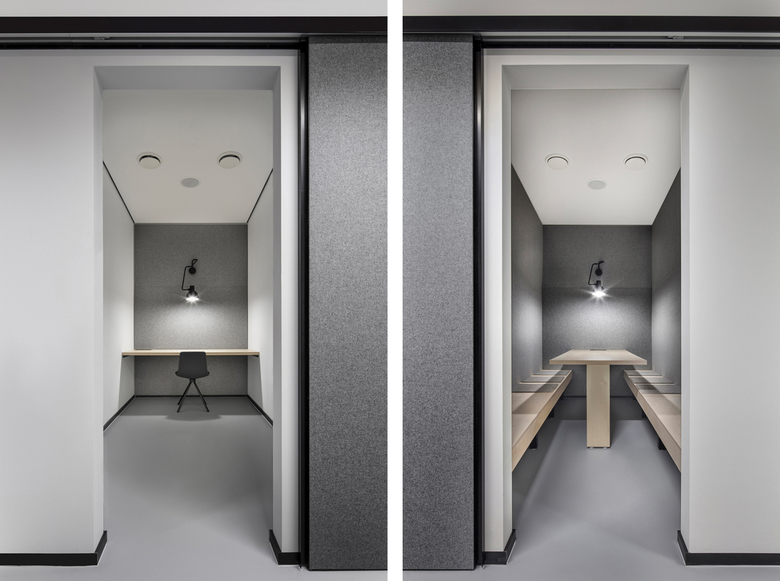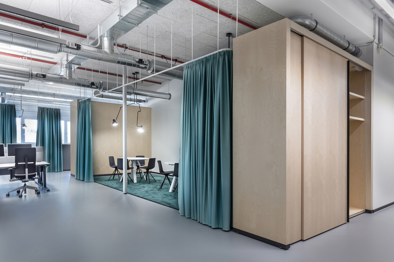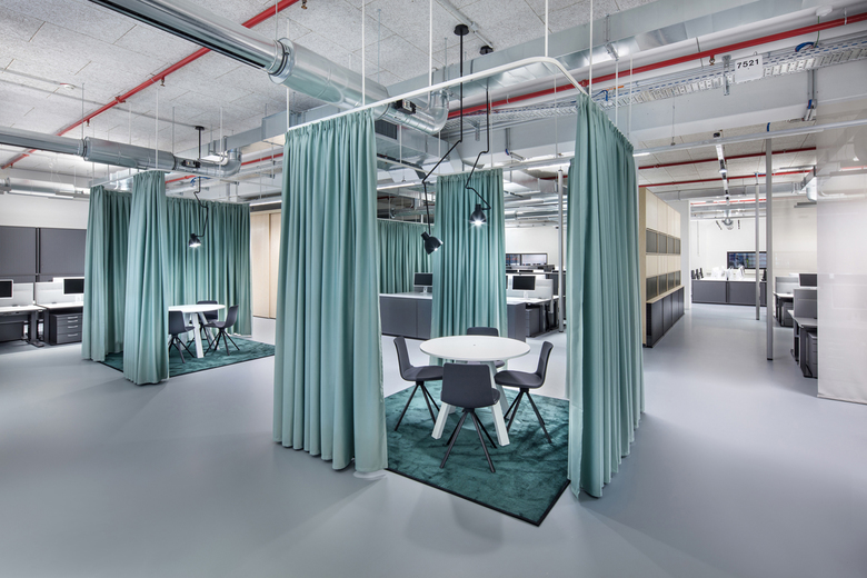 The new office space is on the first floor of the logistics building and right next to a high-rise warehouse. In three zones that run parallel to the façade there are many different working situations: Open Space and Desk Sharing areas, group offices, meeting rooms, Focus Rooms, and a spacious lounge. They meld into an overall concept that optimally balances open and closed areas, to promote exchange and facilitate concentration. The multifunctional meeting pools are separated by walls, glazing or curtains to meet different acoustic and privacy needs. Three specially designed video conferencing rooms make it easier for employees around the world to communicate. As a place for community and communication, the lounge with a café counter and sofa area is at the center of the space. In the Focus Rooms, employees can retreat to concentrate on their work. The room layout must meet demands for great flexibility: Thanks to appropriate technical pre-installations, open-space areas can be subdivided at any time.