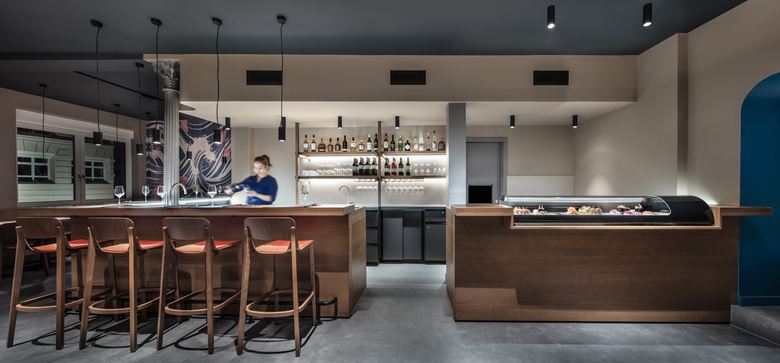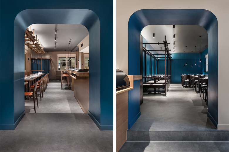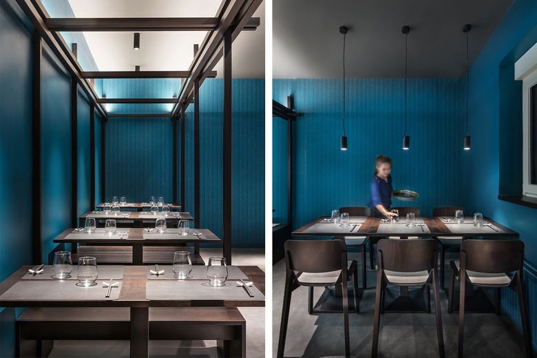 Light and shadow – eternal duality or a perfect match? This fascinating interaction, as depicted in the seminal essay “In Praise of Shadows”, has already established itself as a key idea in Japanese aesthetics. Even the restaurant’s name – “Akeno” (“brightly lit” in Japanese) – is a reference to that idea, which permeates the entire room design concept. The 100 square meter restaurant was divided into two sections – a light section and a dark section. In the front, the setting is marked by beige-colored walls and light oak furniture, creating a striking contrast to the petrol-black colors and dark-stained furniture in the rear area. Depending on how they feel, guests can opt for dining in more jovial and informal or more intimate surroundings, while the controlled activation and deactivation of individual lighting channels enhances the unique atmosphere of each room. An arched doorway connects the two sections. When a visitor enters the restaurant, this opening gives them a glimpse into the back room, awakening their curiosity and once more accentuating the contrast between light and darkness.