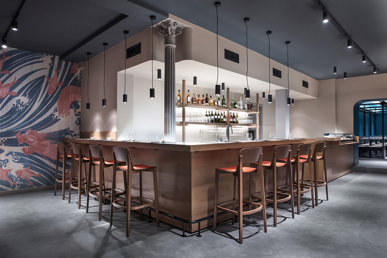 Traditional Japanese modular design was a source of inspiration for a recurring decorative element. This structure, which resembles a wooden knot, can be found in the vestibule, on the bar shelves, in the ceiling installation along the edge of the room, and in the berth element of the rear section. Integrated LED rods and suspended luminaires set the perfect stage for these knot-like objects. Here, again, the interaction between light and shadow is visualized in an impactful manner.