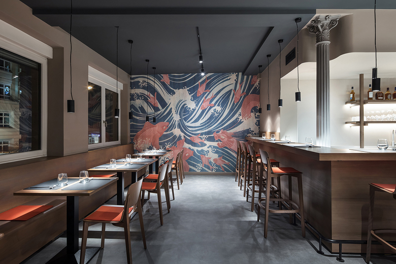 The koi carp can be found everywhere in Japanese art and pop culture. It symbolizes values such as strength and endurance, yet is also associated with luck and success. In Akeno, the koi motif was vividly implemented in the design of the wallpapers and serves to focus the attention of observers in both rooms. In the front section, the koi motif introduces a further signature color, a bright orange. In the rear section, the graphic scale pattern stands out discreetly against the uniform wall color.