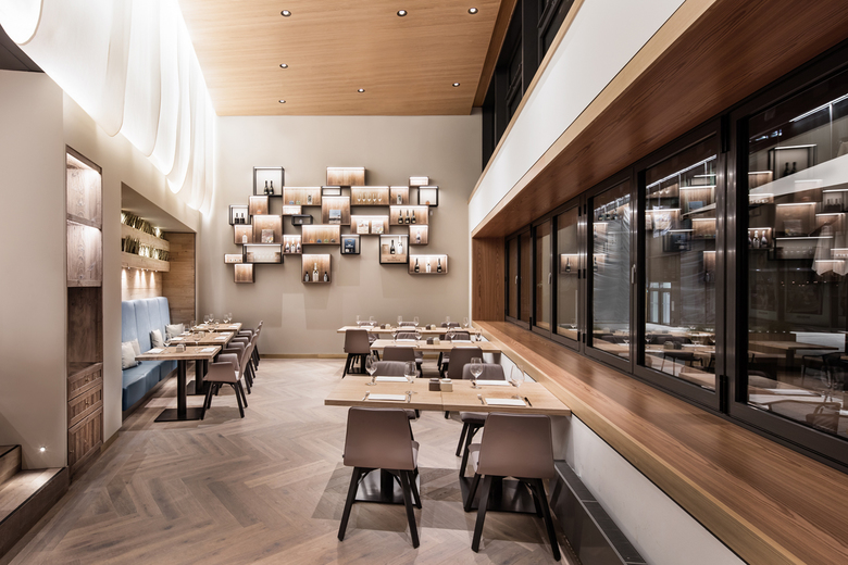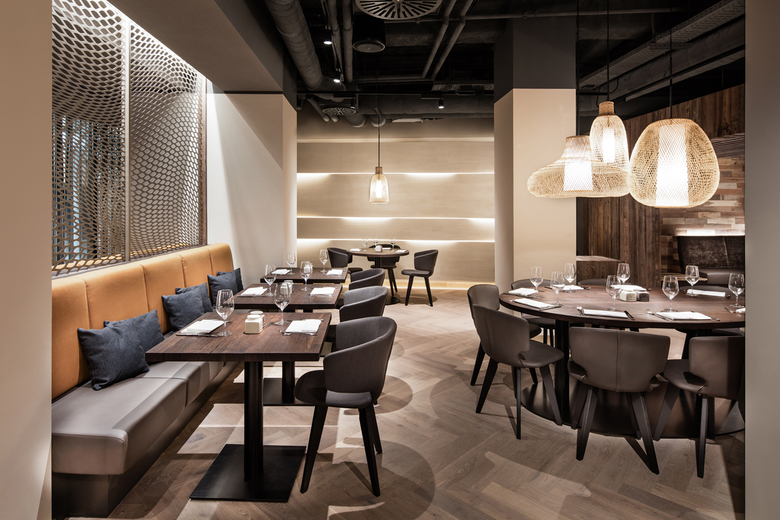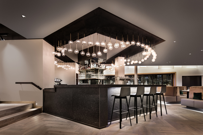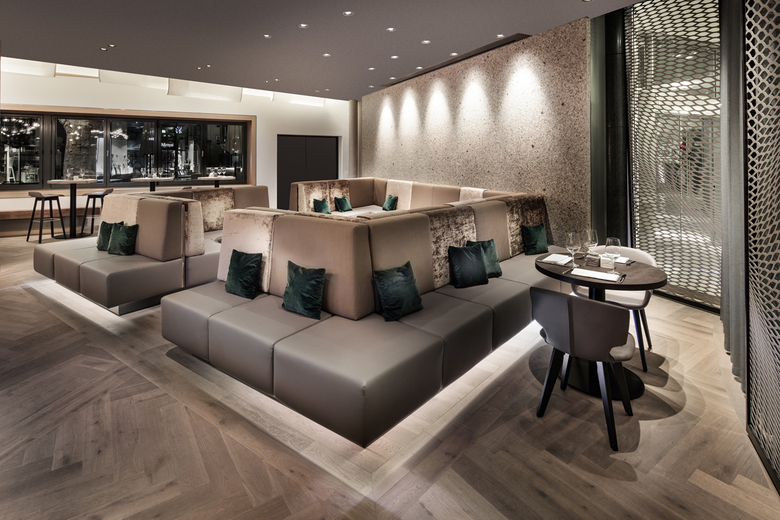 Strikingly designed and stunningly lit, the bar in the centre is a magnet for anyone entering the restaurant. Open on four sides it connects all of the areas together and creates multiple vantage points. The noble Jura slate body blends perfectly with the flagstone bar, which flows into the dark oak wood centrepiece via a brass strip. Mounting in a wave-like fashion, the custom-made designer lights contrast with the angular feel of the assertive bar.