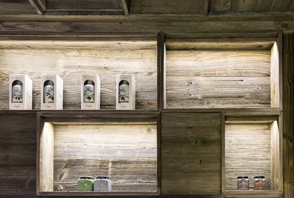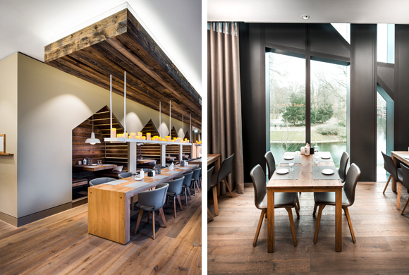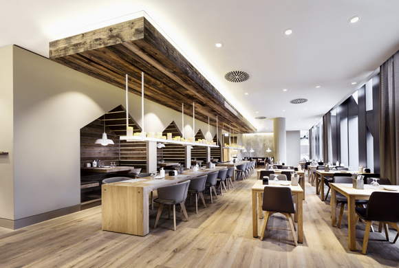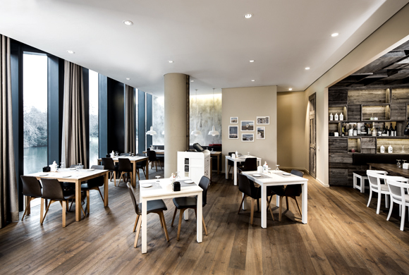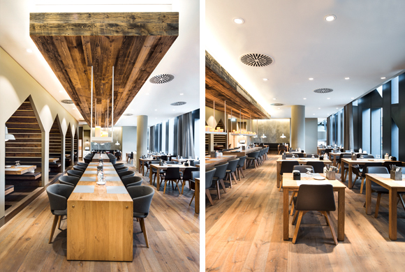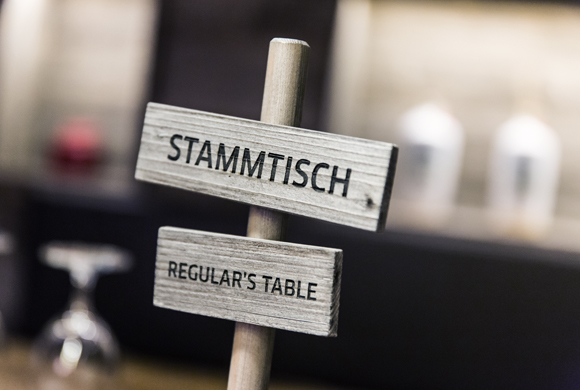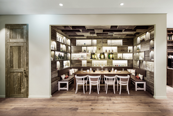 The regulars’ table in one corner offers large groups a cosy place for withdrawal. The focus here is on wine. The wall and ceiling are made of a panelling material which looks like stacked wine crates. A window integrated in the panelling offers a glimpse of the well stocked climate controlled wine cellar. Above the solid patinated table, lamps made of wine bottles provide mood lighting.