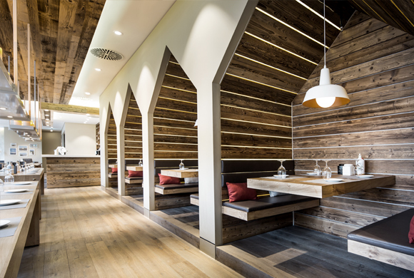 In order to experience the atmosphere of Sylt, typical materials were used, such as old wood for the panelling and tables made of solid oak. Wine is a key theme for the Sansibar, and this was integrated in the draft plans as a characteristic element.
