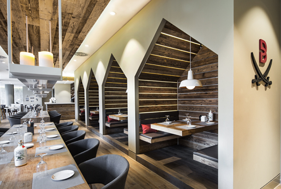 A second ingenious feature besides the regulars’ table is the four booths bathed in indirect lighting. The represent simple wooden huts but their design and lighting are simplistic and modern, again demonstrating a definite link to the Sansibar on Sylt.