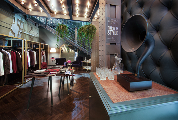 A bar area at the side, reflecting the ‘Mad Men’ world, demonstrates the brand’s contemporary urban style. Here dark-stained oak is featured in a fishbone design. Brass-coloured fixtures, stucco work and leather on the walls and columns paired with a green-grey tone create a smoky ambience. The colourful giveaways offer a striking contrast and serve as decorative elements: notebooks featuring the new Tom Tailor pattern and logo.