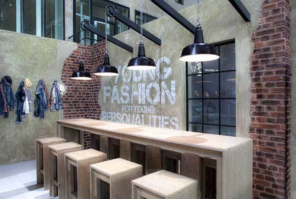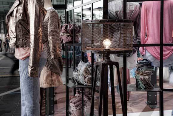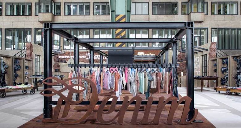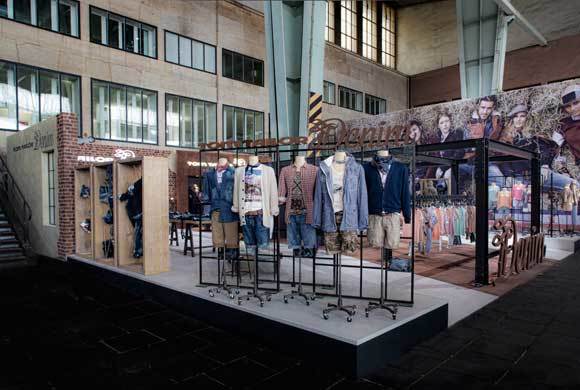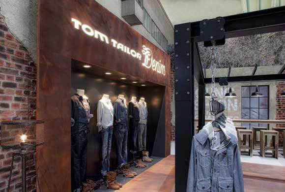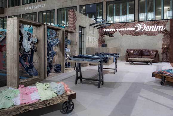 On 165 sqm Tom Tailor´s Denim brand is presented in an industrial context. Brick walls, industrial lamps, old factory windows and vintage furniture create a rough look which stands in contrast to the clothing. The main walkway was made to look like weathering steel and drew visitors through the centre of the stand , highlighting the entrance and main path through the area for the clients. The highlight of the area was positioned on that main walk way: a steel construction weighing 20 tonnes that serves as the main product carrier. The latest collection is presented on leather straps, steel tracks, nails, ropes and T-sections.