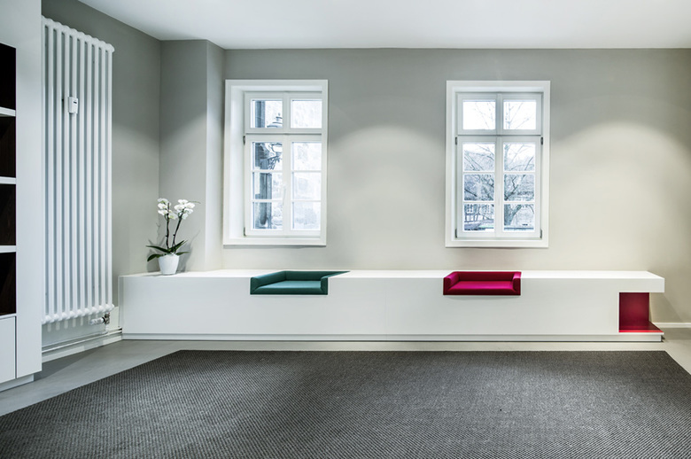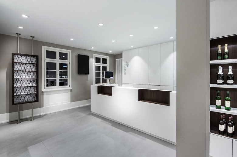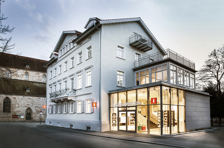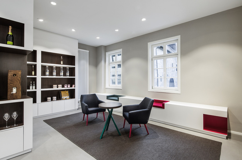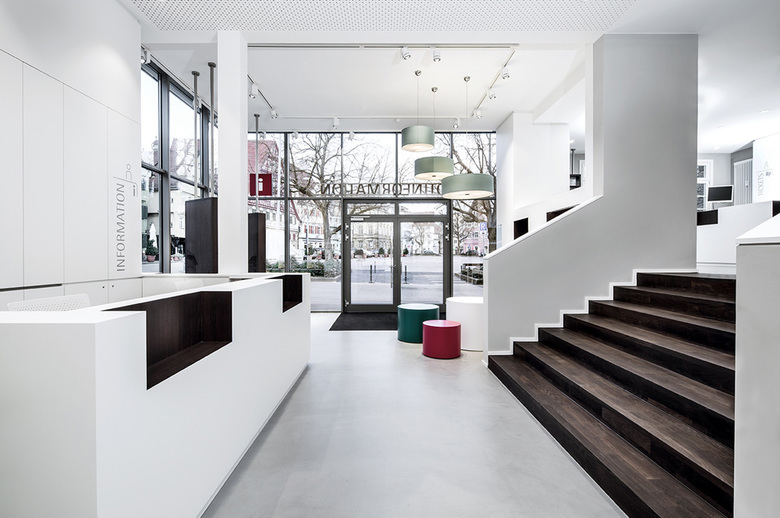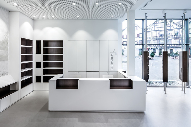 All fitted furniture is designed in a simplistic, restrained white. The niches in the shelving were designed in dark oak to highlight the products on display. The Esslingen town colours were used discreetly on selected items of furniture to underline the links of Esslingen citizens to their popular town information office. A well-conceived and energy efficient lighting concept gives the rooms a cosy feeling during the day and lets the building stand out stunningly on the Esslingen market square at night.