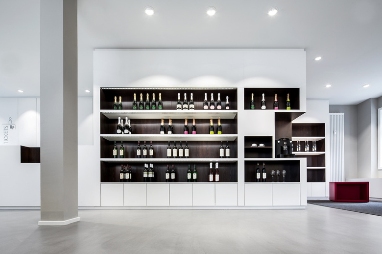 The entrance to the Town Information Office is a glass cube annexed to the Späth’sches Haus. The visitor’s attention is immediately drawn by the ingenious perforated sheet graphic bearing the outline of Esslingen Castle. The sales room is divided into two levels, achieving an interesting and inviting feeling of space. The information and sales area are located in the entrance on the ground floor. The upper level, which is the old building, is reserved for the sale of events tickets and culinary delicacies grown in the region. A small seating area invites visitors to relax, drink coffee and browse the literature available.
