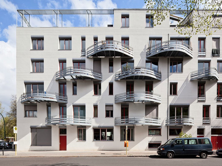 Das Tragwerk des Hauses beschränkt sich auf Decken, Stahlbeton-Aussenwände und 2 Eckstützen. Aus der waagerechten Bänderung schwingen sich Balkone in leichter Stahlkonstruktion aus der Fassadenebene heraus. Die Hoffassade in Holztafelbau wird von umlaufenden, frei auskragenden Laubengängen in wechselnder Tiefe begleitet.